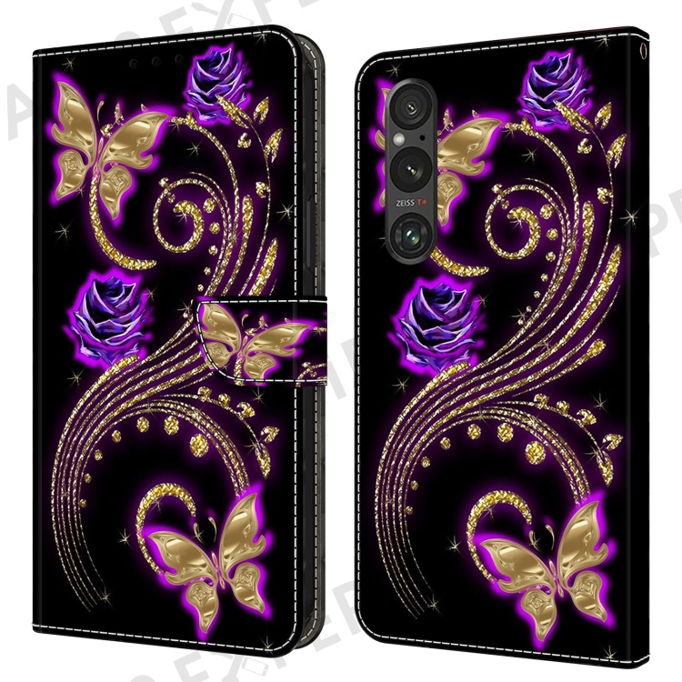 For Sony Xperia 1 V Wallet PU Leather Protective Case 3D Pattern Printing Stand Phone Cover - Purple Flowers / Butterflies
