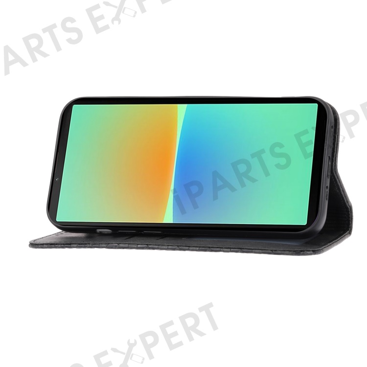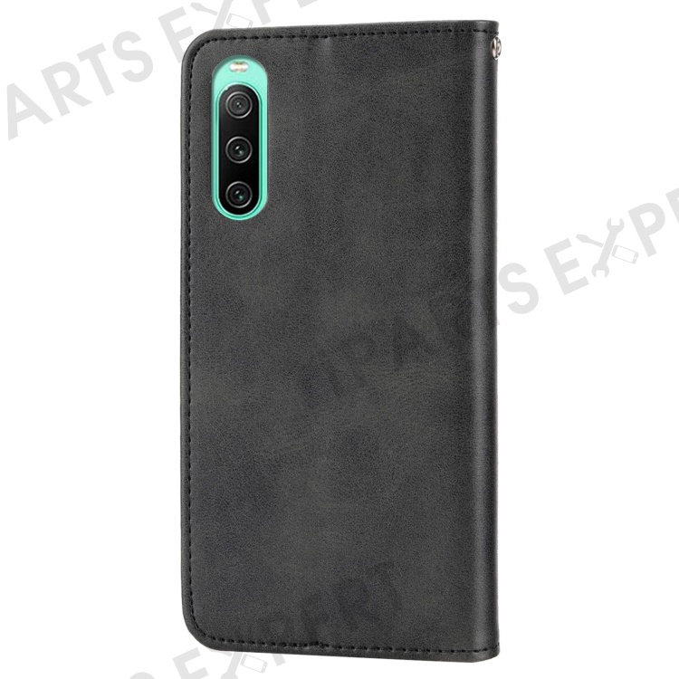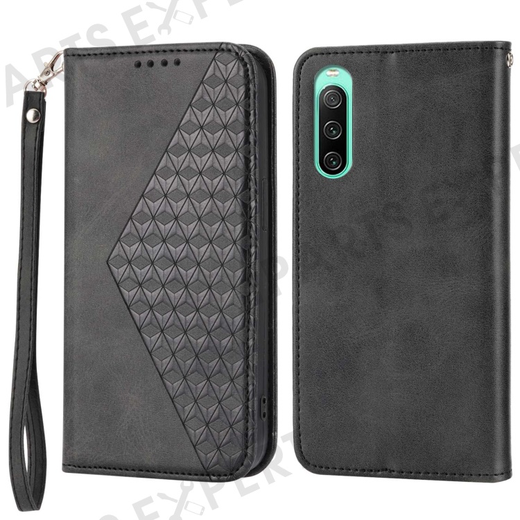 For Sony Xperia 10 IV 5G Calf Texture PU Leather Case Stand Wallet Imprinted Rhombus Pattern Magnetic Phone Cover with Strap - Black