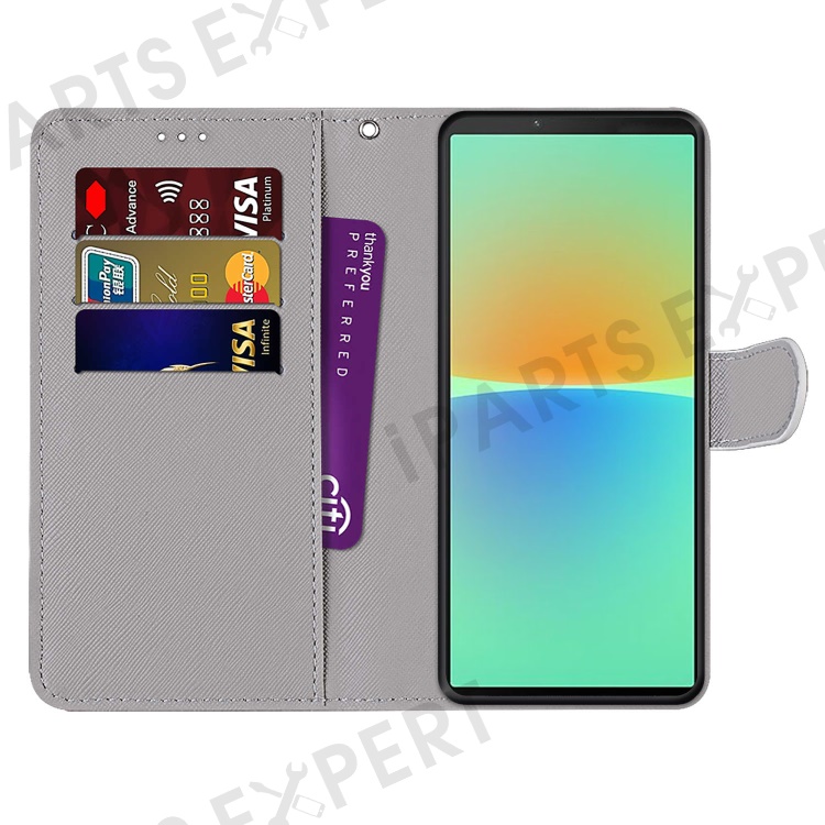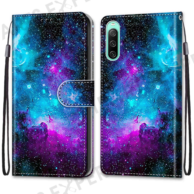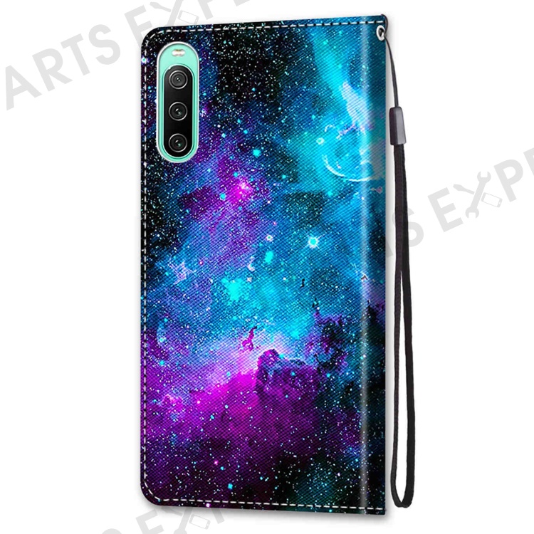 For Sony Xperia 10 IV 5G Pattern Printing Shockproof Phone Wallet Case PU Leather Stand Flip Phone Cover with Wrist Strap - B15 Purple / Green Starry Sky