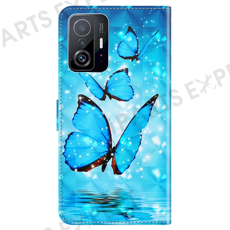 For Xiaomi 11T 5G / 11T Pro 5G PU Leather Flip Case Elegant 3D Pattern Printing Magnetic Closure Stand Wallet Phone Cover with Strap - Blue Butterflies