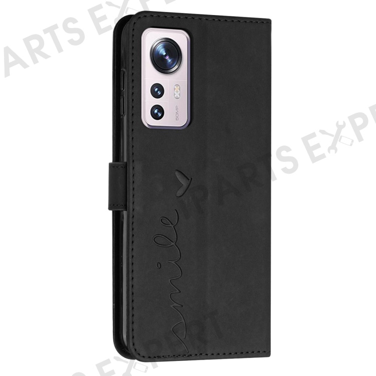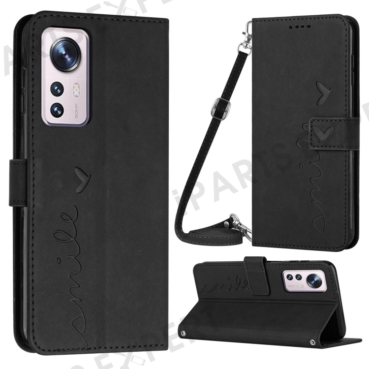 For Xiaomi 12 Lite 5G Imprinted Heart Shape Folding Stand Cover Skin-touch Feeling PU Leather Wallet Flip Magnetic Phone Case with Shoulder Strap - Black