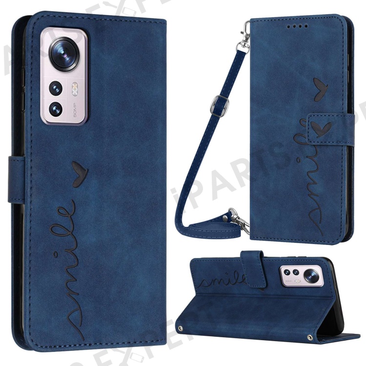 For Xiaomi 12 Lite 5G Imprinted Heart Shape Folding Stand Cover Skin-touch Feeling PU Leather Wallet Flip Magnetic Phone Case with Shoulder Strap - Sapphire