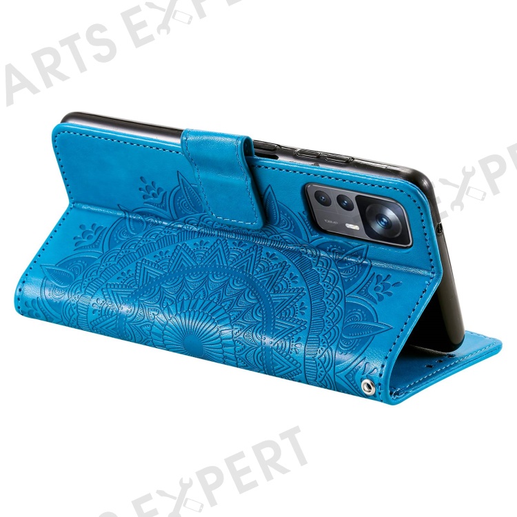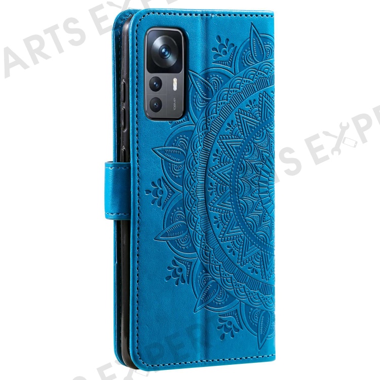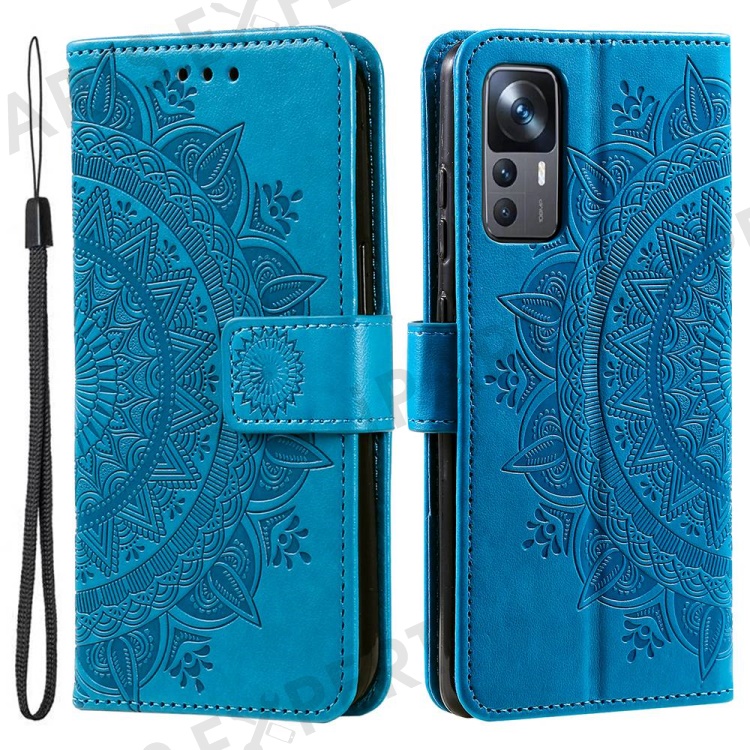 For Xiaomi 12T 5G / Redmi K50 Ultra 5G / 12T Pro 5G Mandala Flower Pattern Imprinted Folding Stand PU Leather Case TPU Inner Shell Wallet Flip Cover with Strap - Blue