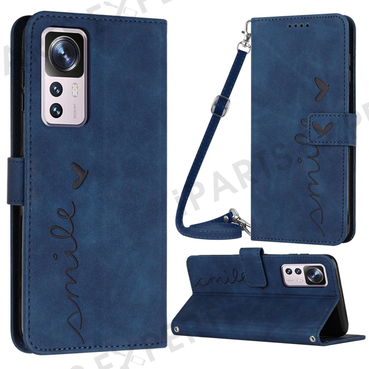 For Xiaomi 12T 5G / 12T Pro 5G / Redmi K50 Ultra 5G Skin-touch Feeling PU Leather Phone Case Imprinted Heart Shape Stand Wallet Magnetic Protective Cover with Shoulder Strap - Sapphire