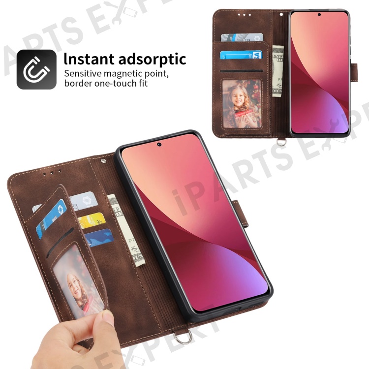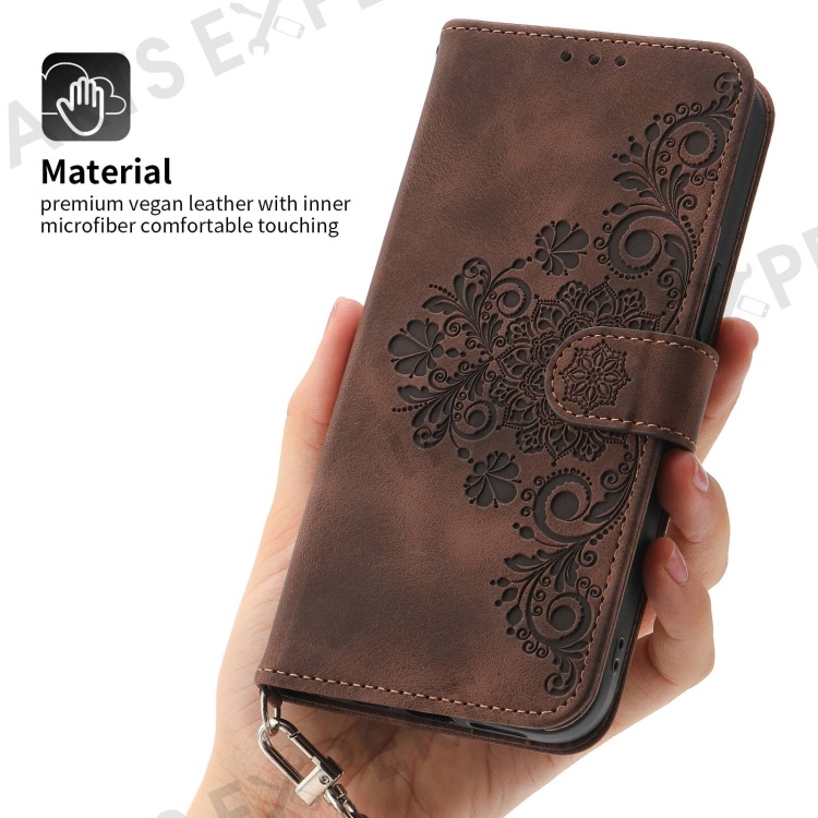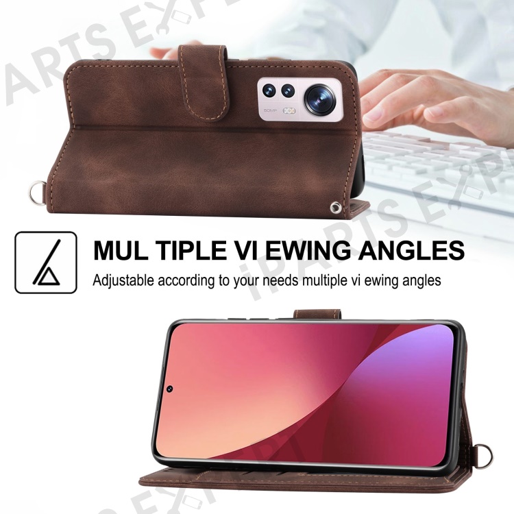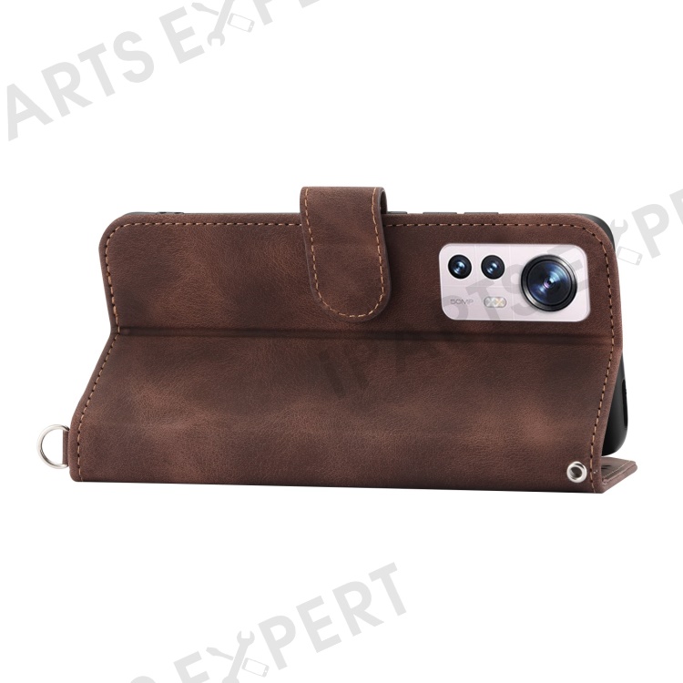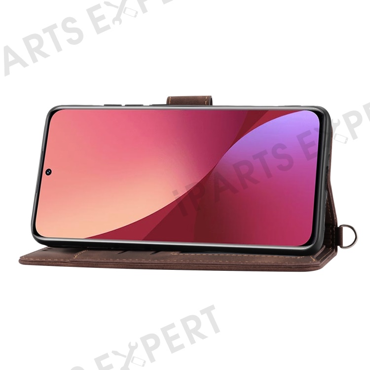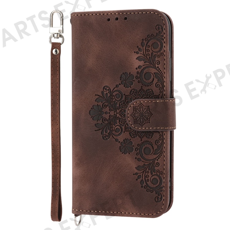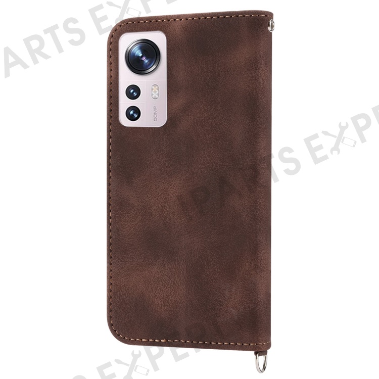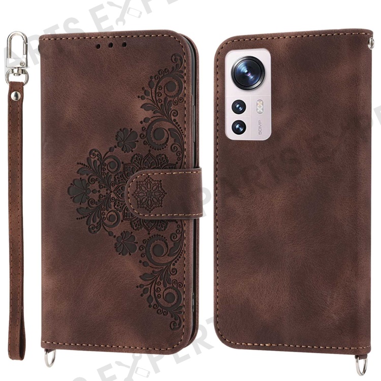 For Xiaomi 12X 5G / 12 5G / 12S 5G Imprinted Flowers Stand Wallet Leather Case Multiple Card Slots Skin-touch Phone Cover with Wrist Strap and Shoulder Strap - Brown