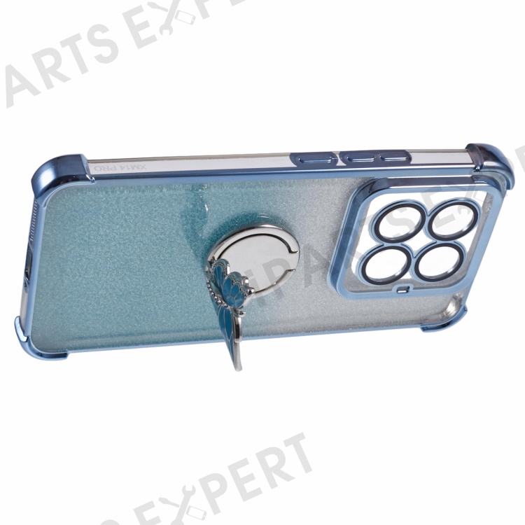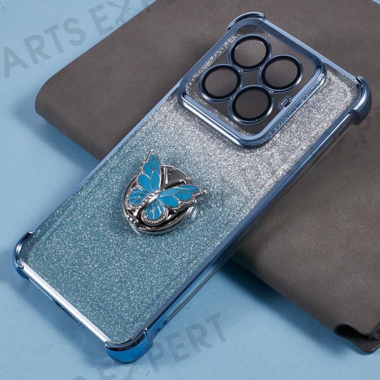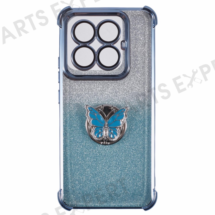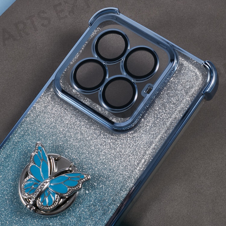 For Xiaomi 14 Pro Case Butterfly Kickstand Glitter TPU Shockproof Phone Cover - Blue