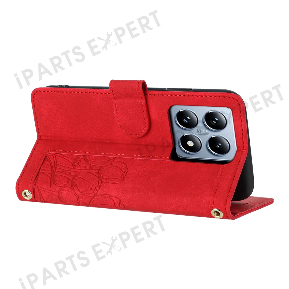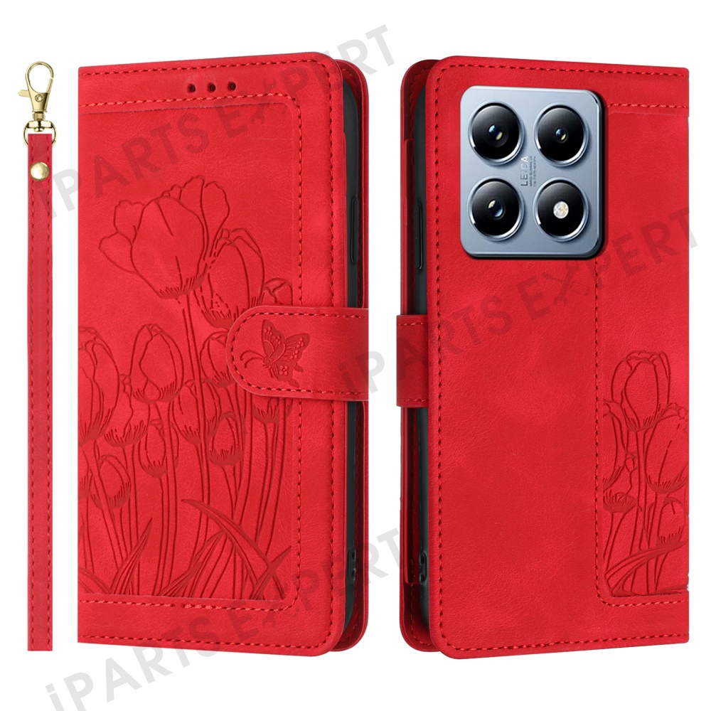 For Xiaomi 14T Tulip Leather Case Phone Cover with 5 Card Slots Wallet - Red