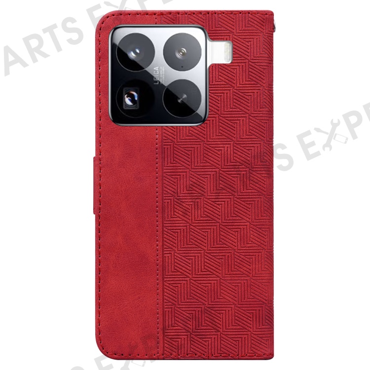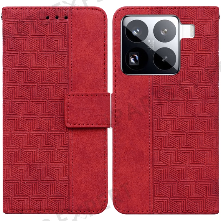 For Xiaomi 15 Pro Case Geometry Pattern Leather Wallet Phone Cover with Wrist Strap - Red