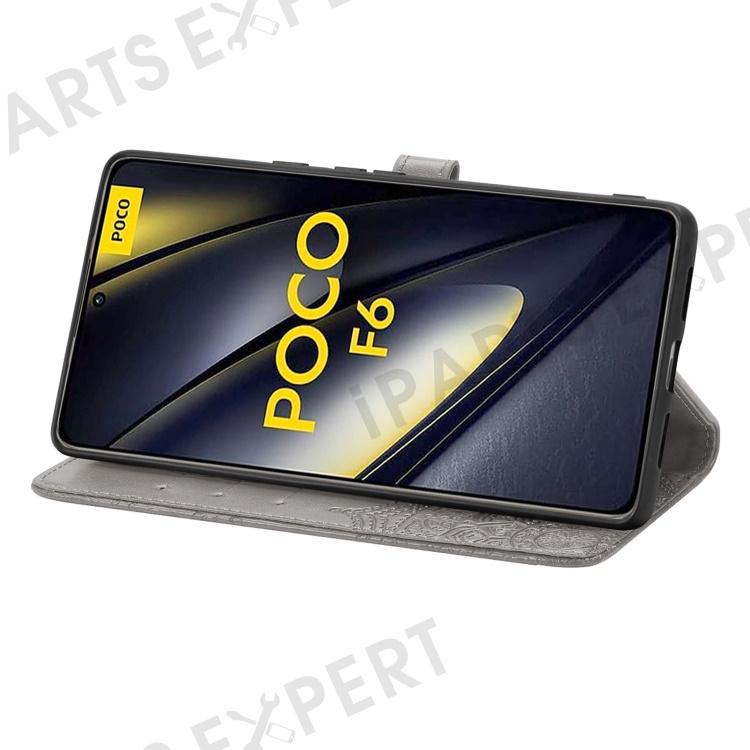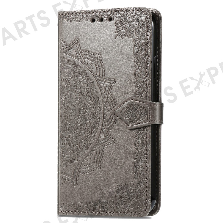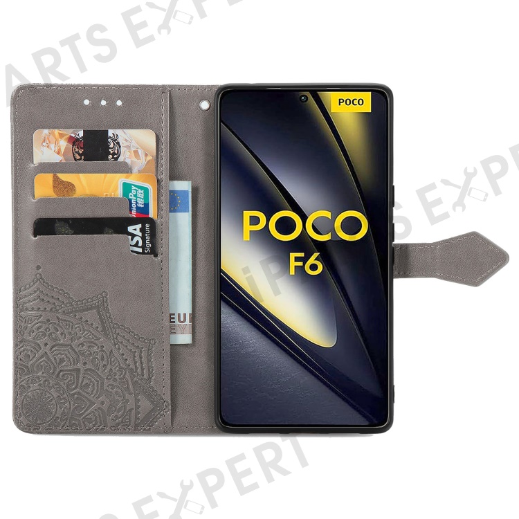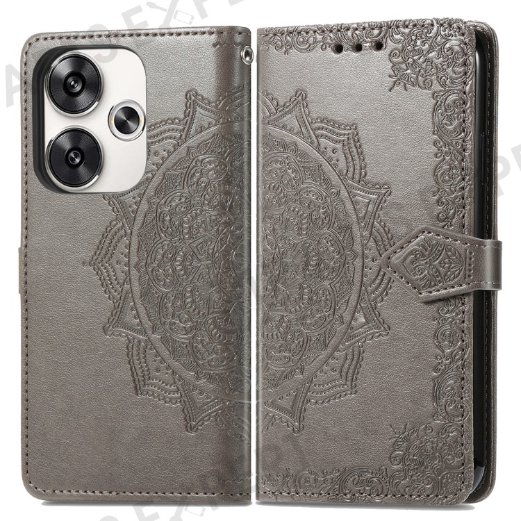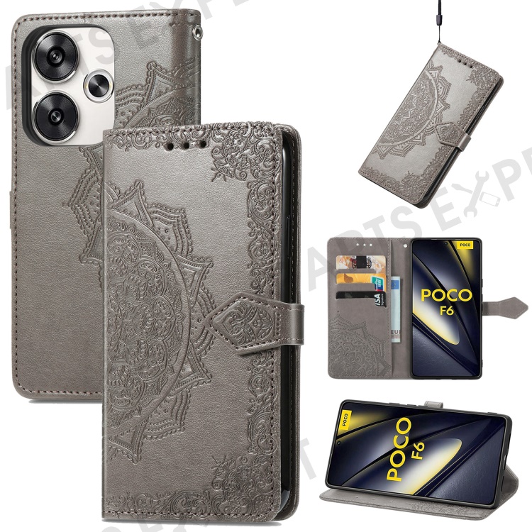 For Xiaomi Poco F6 5G / Redmi Turbo 3 5G Case Mandala Embossed Design Leather Wallet Phone Cover - Grey