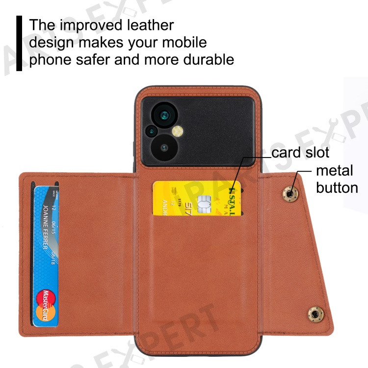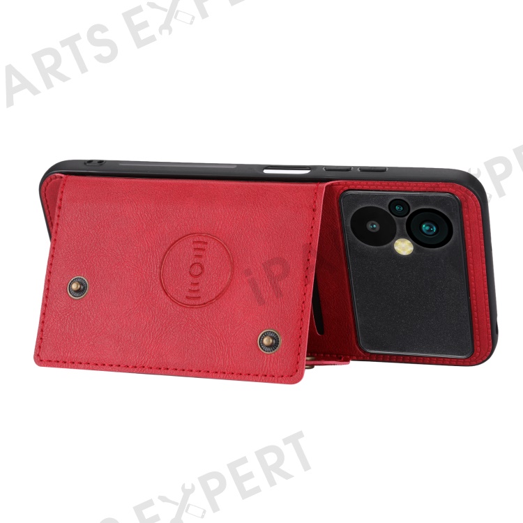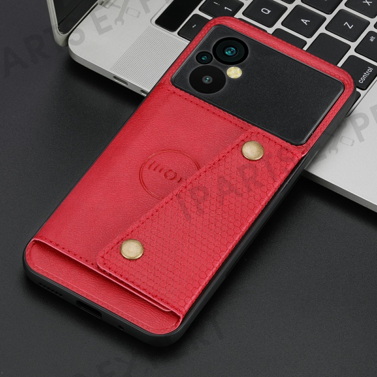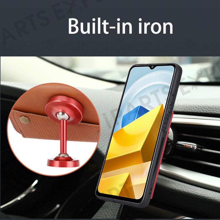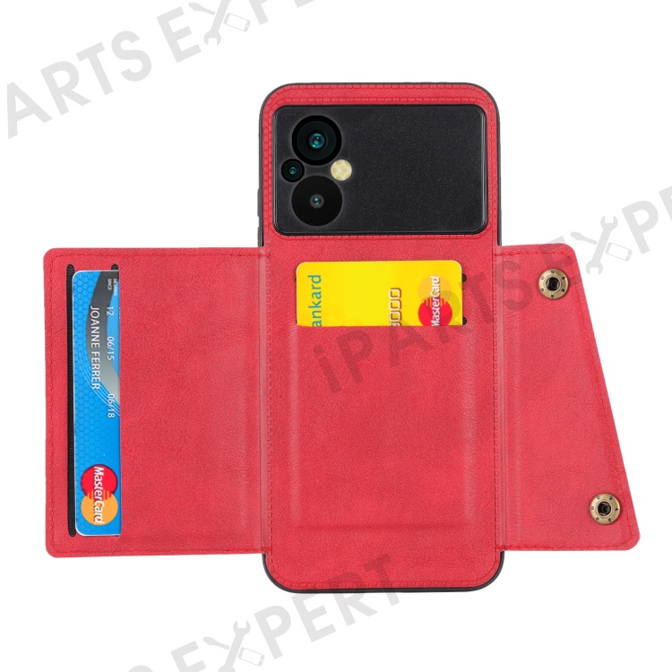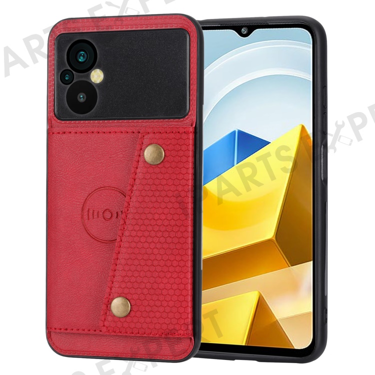 For Xiaomi Poco M5 4G Dual Button Card Slots Phone Case Magnetic Holder Built-in Metal Sheet Leather Coated TPU Kickstand Cover - Red