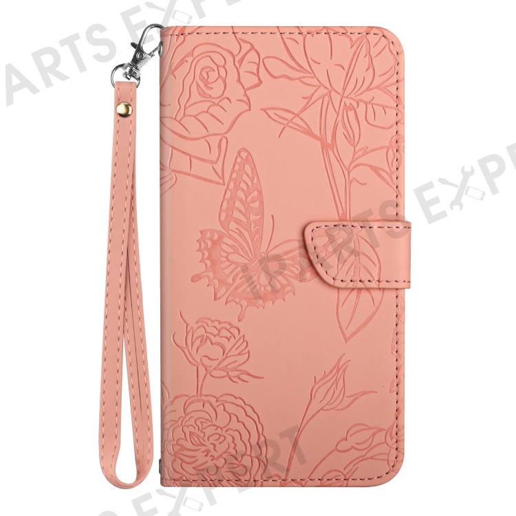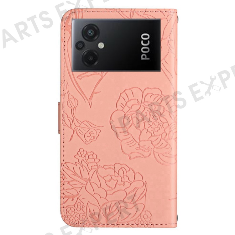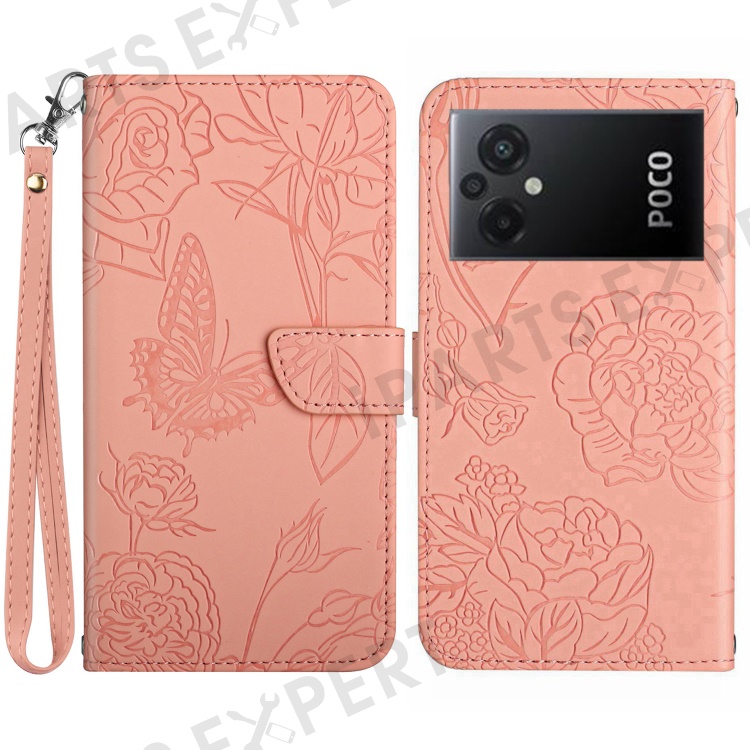For Xiaomi Poco M5 4G Skin-touch Butterfly Flowers Imprinting PU Leather Stand Case Phone Wallet Cover with Hand Strap - Pink