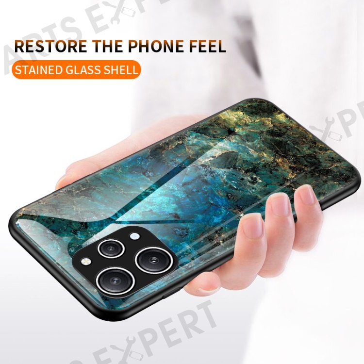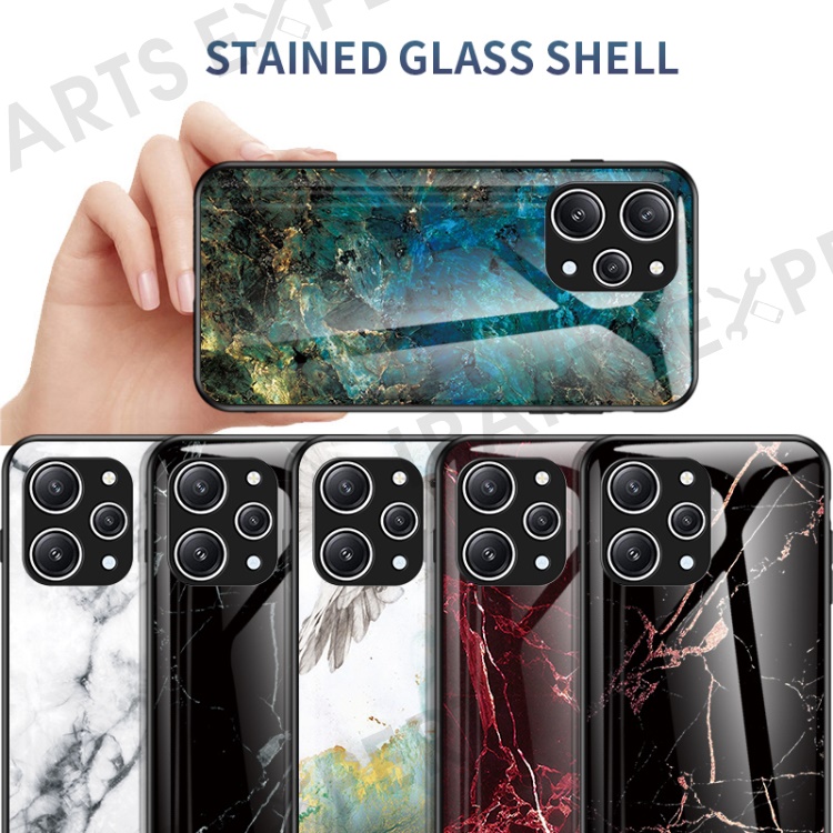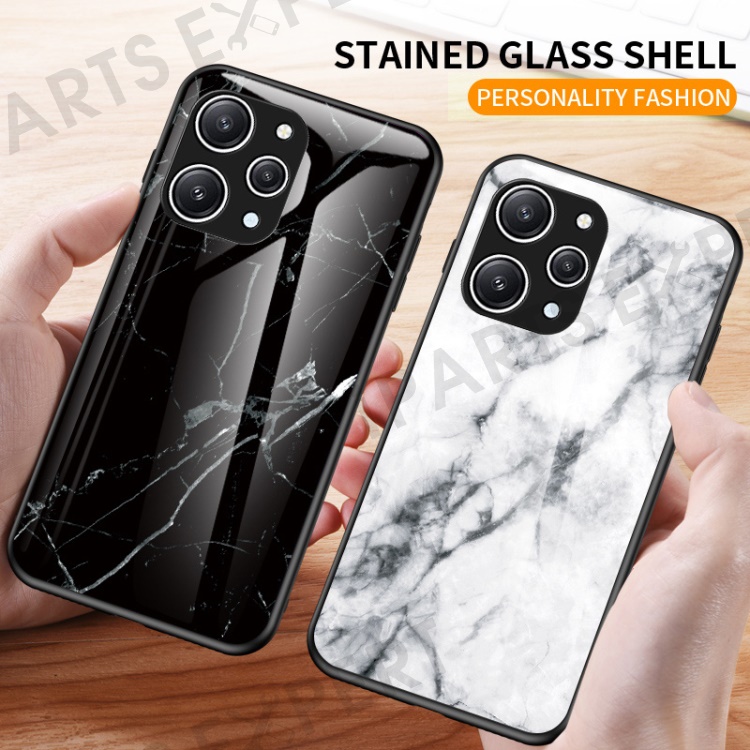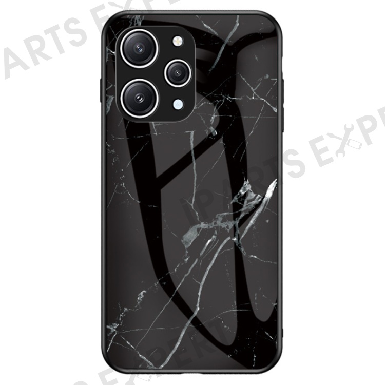 For Xiaomi Redmi 12 4G Shockproof Hybrid Case Tempered Glass+ PC+TPU Marble Pattern Phone Cover - Black Marble