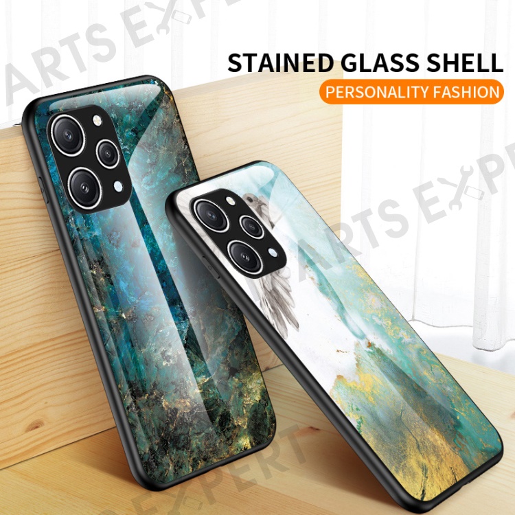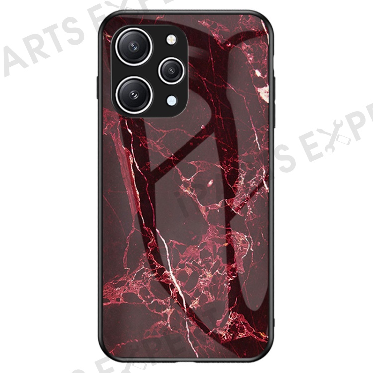 For Xiaomi Redmi 12 4G Shockproof Hybrid Case Tempered Glass+ PC+TPU Marble Pattern Phone Cover - Blood Red Marble