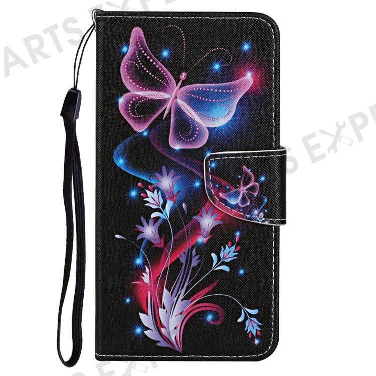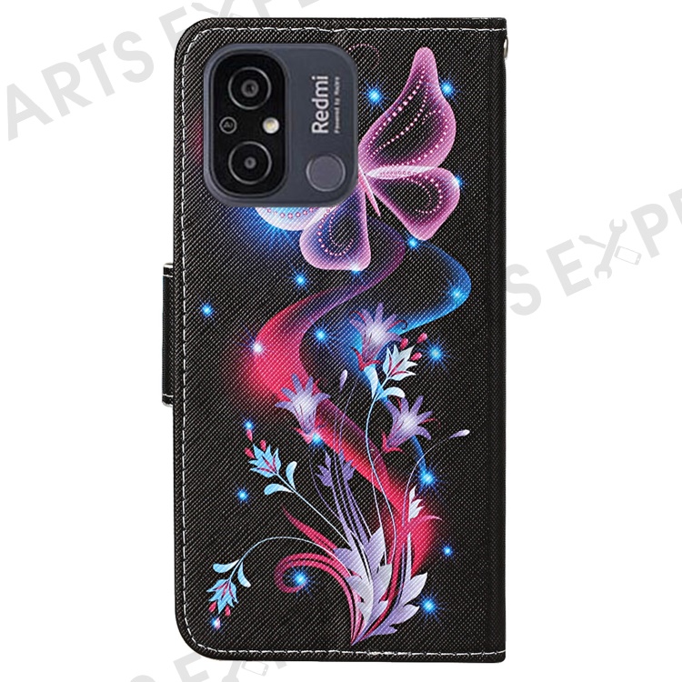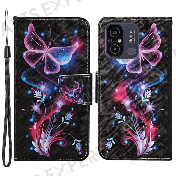 For Xiaomi Redmi 12C 4G PU Leather Flip Phone Case Pattern Printing Stand Wrist Strap Wallet Cover - Fluorescent Butterflies