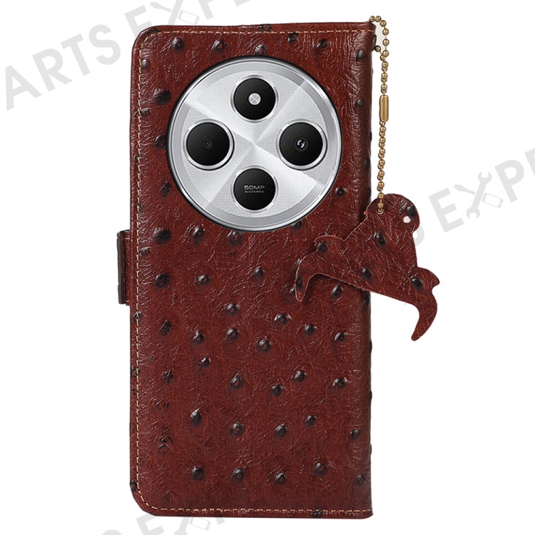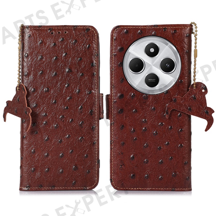 For Xiaomi Poco C75 4G / Redmi 14R 5G / 14C 4G Case RFID Blocking Genuine Cow Leather Phone Case Ostrich Texture - Coffee