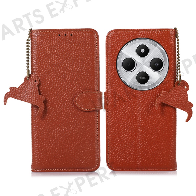 For Xiaomi Poco C75 4G / Redmi 14R 5G / 14C 4G Case RFID Blocking Litchi Texture Genuine Cow Leather Phone Cover - Brown