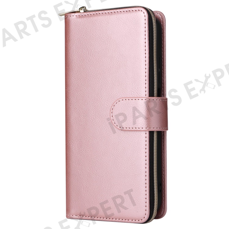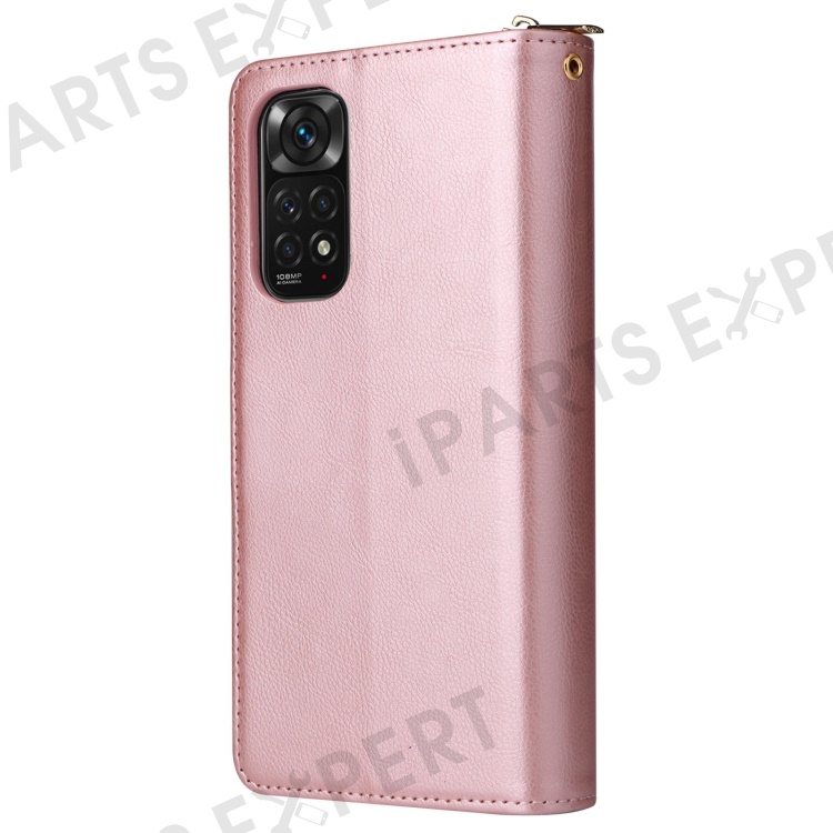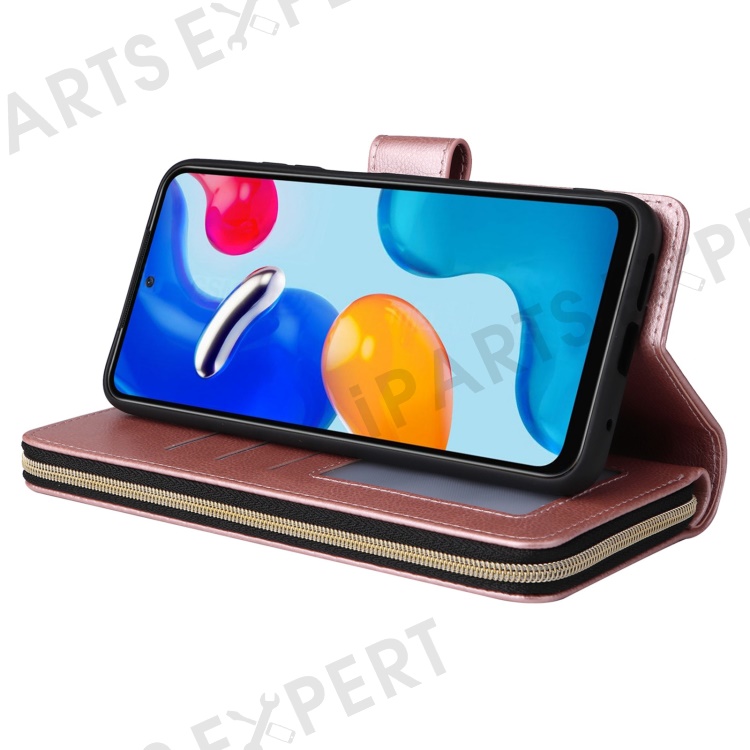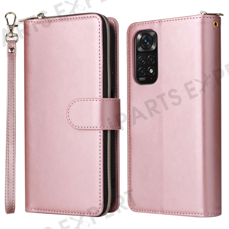 For Xiaomi Redmi Note 12 Pro 4G / 11 Pro 4G (MediaTek) / Note 11 Pro 5G (Qualcomm) / Note 11E Pro 5G PU Leather Zipper Pocket Case 9 Card Slots Flip Stand Cover with Strap - Rose Gold