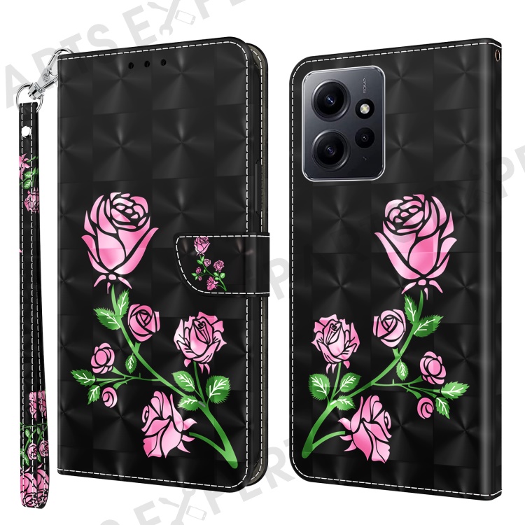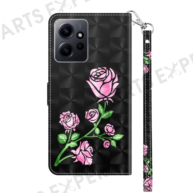 For Xiaomi Redmi Note 12 4G Phone Stand Case PU Leather 3D Pattern Printing Wallet Cover with Strap - Rose Flower