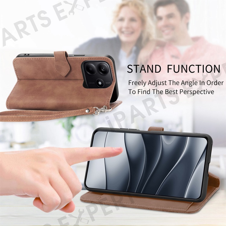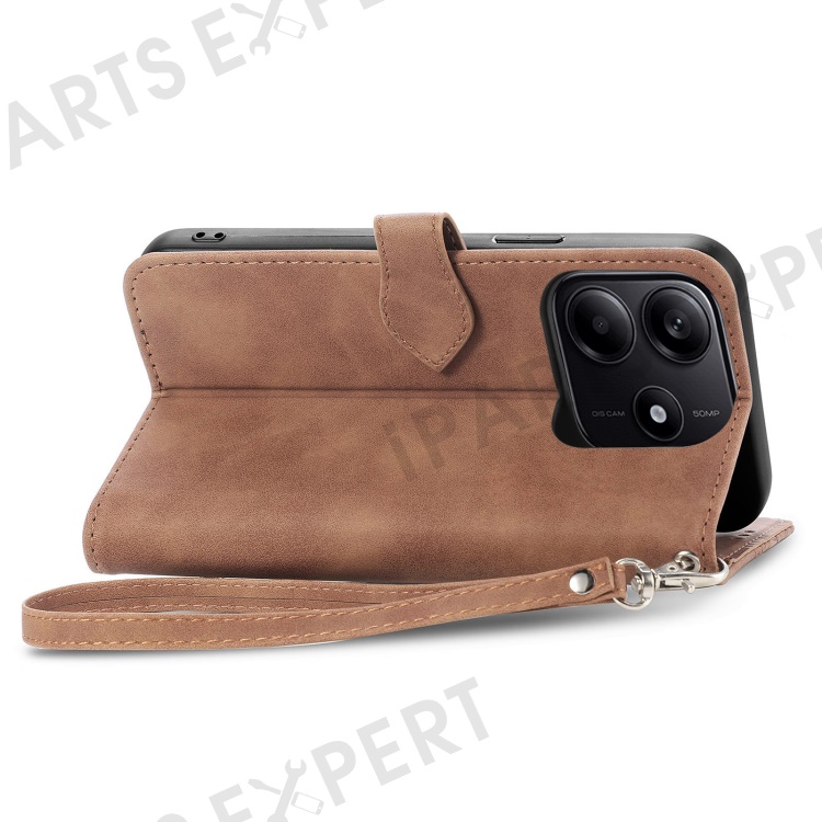 For Xiaomi Redmi Note 14 5G Zipper Wallet Case with Strap Flower Imprint PU Leather Phone Cover - Brown