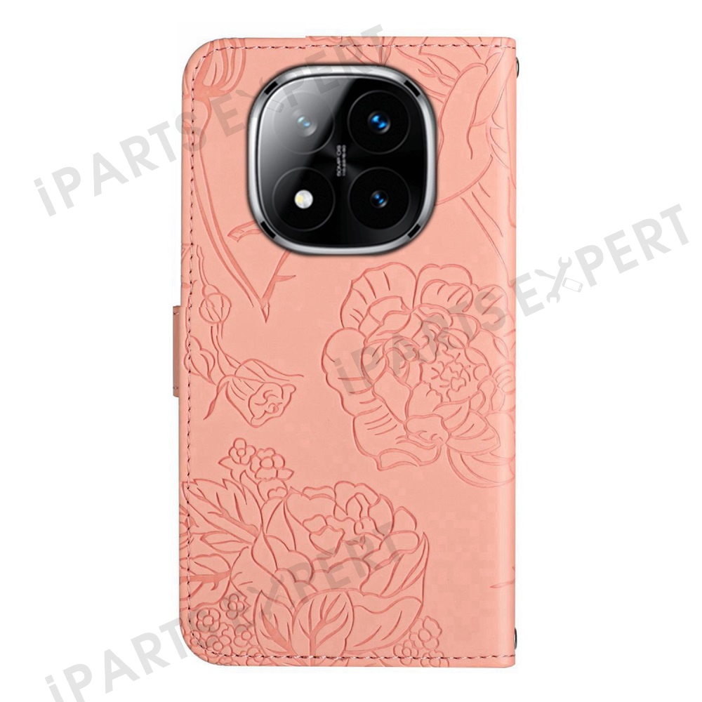 For Xiaomi Redmi Note 14 Pro 4G Case Butterfly Flower Imprinted Leather Phone Cover with Strap - Pink