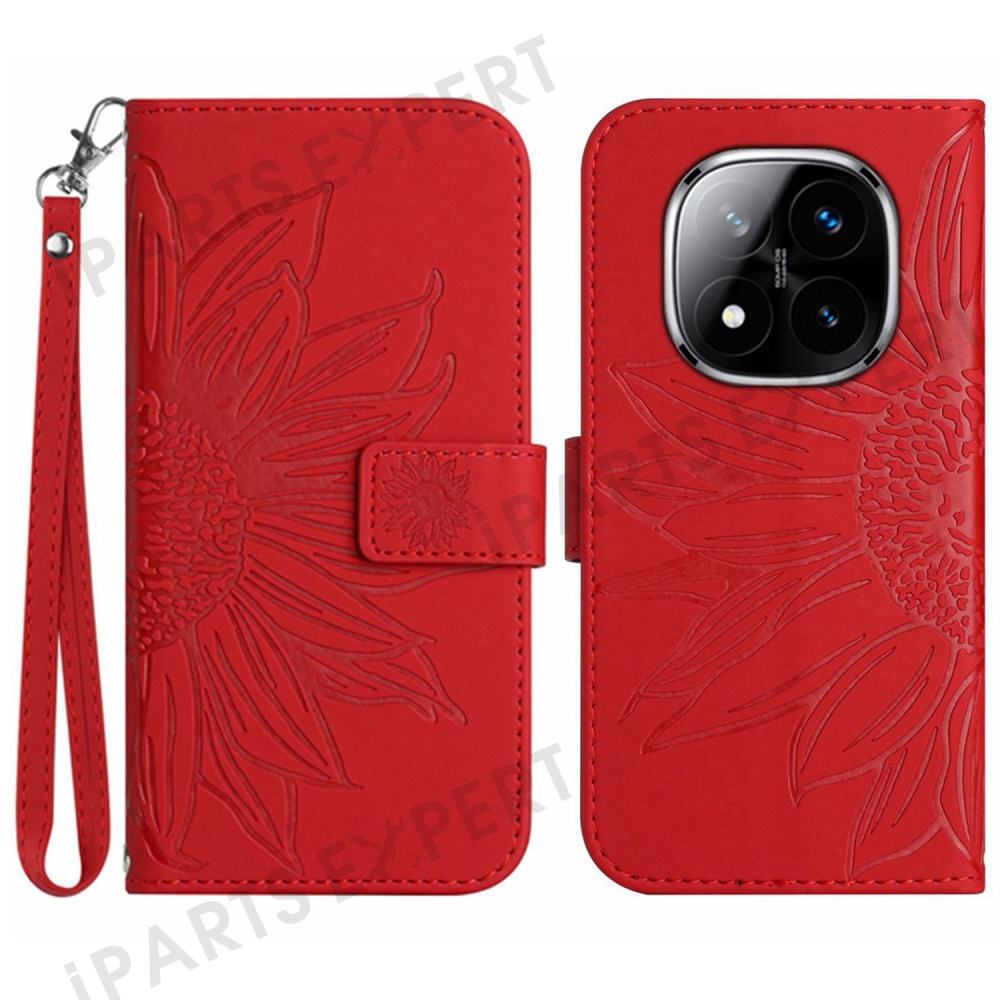 For Xiaomi Redmi Note 14 Pro 4G Case Sunflower Imprint Leather Wallet Phone Cover with Wrist Strap - Red