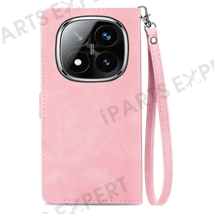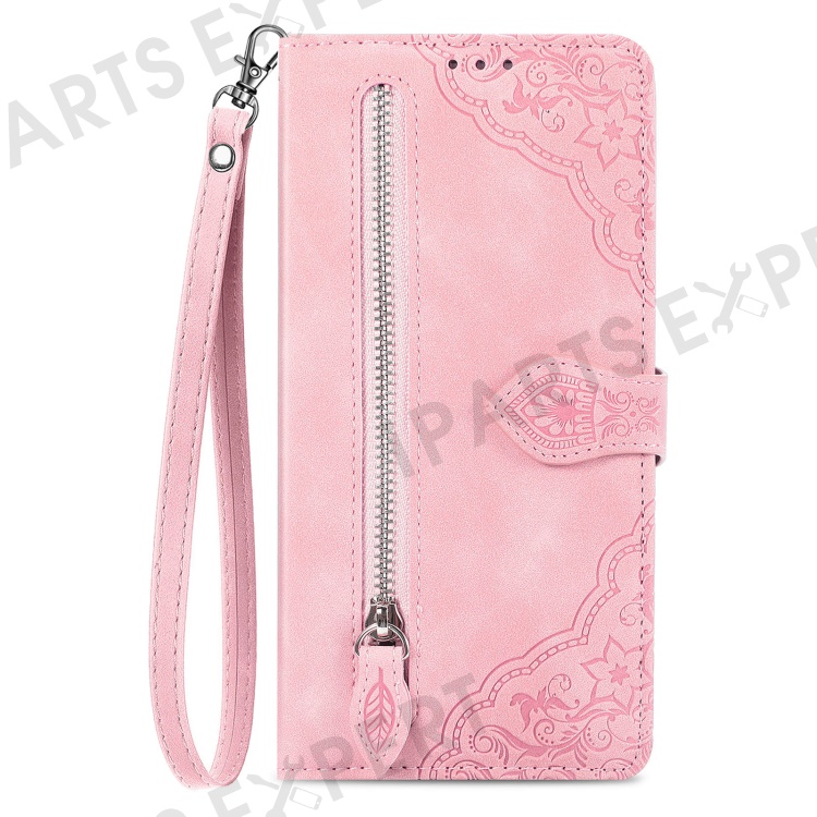 For Xiaomi Redmi Note 14 Pro+ 5G Zipper Wallet Case with Strap Flower Imprint PU Leather Phone Cover - Pink