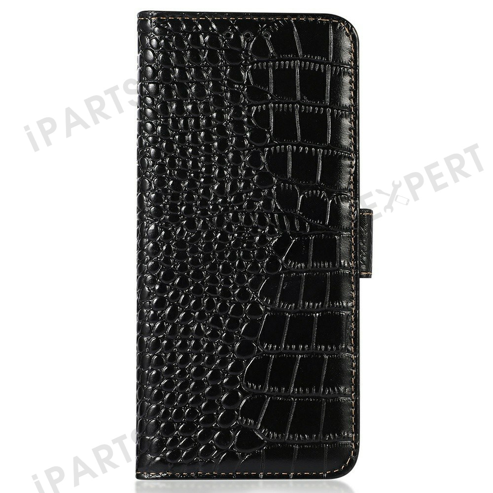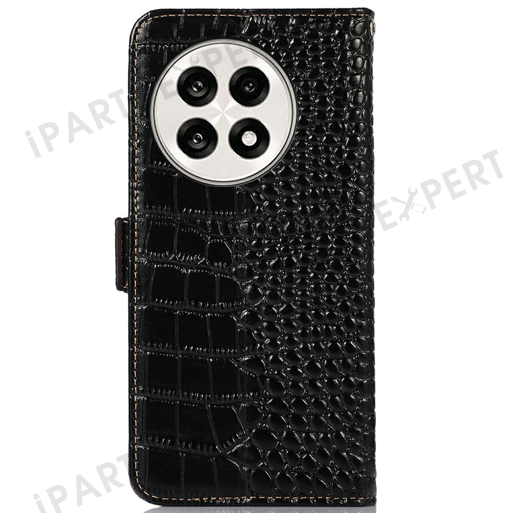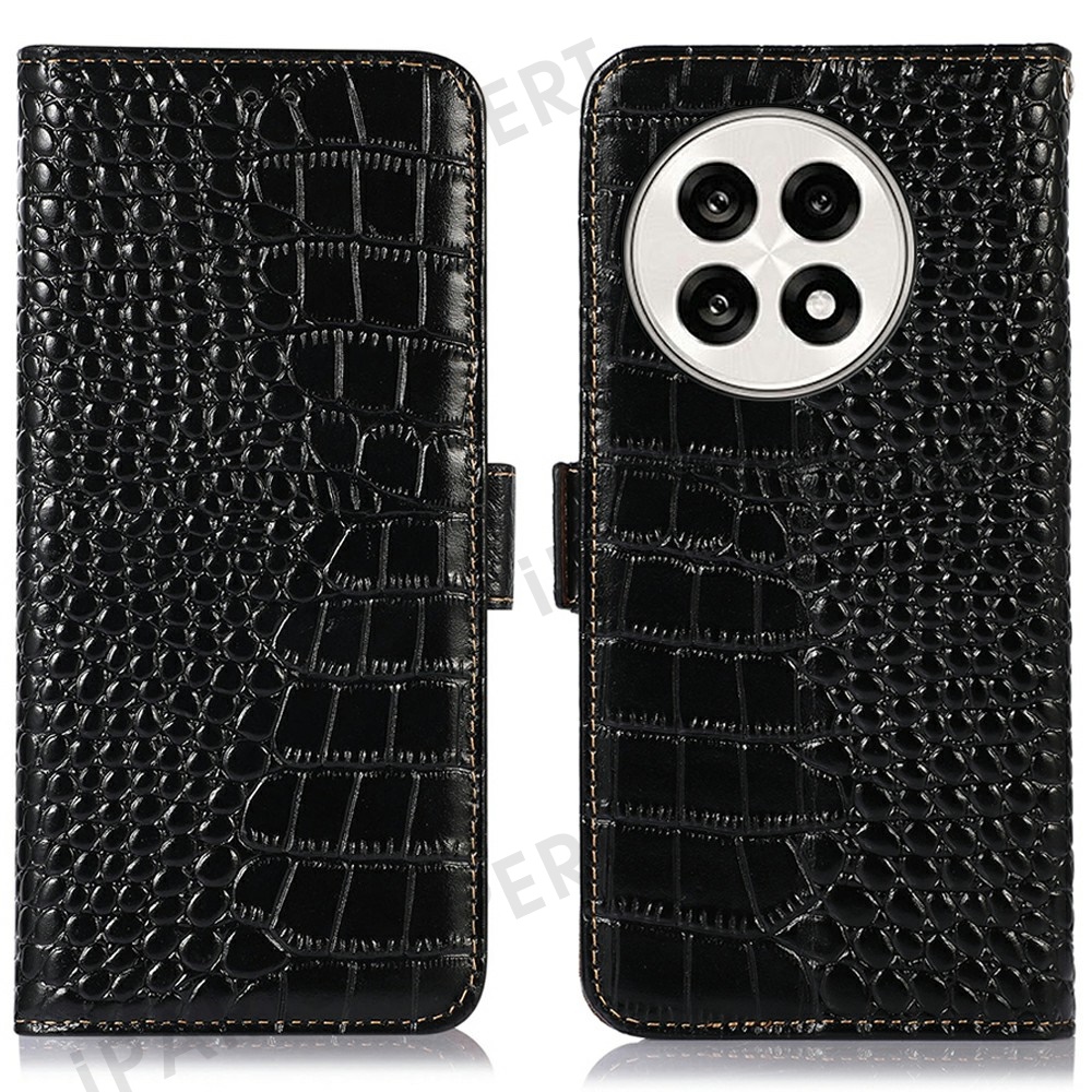 Genuine Cow Leather Phone Case for OnePlus Ace 5 Pro 5G / Ace 5 5G / 13R 5G Crocodile Texture Phone Wallet Cover - Black