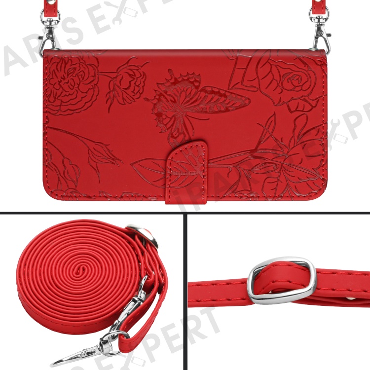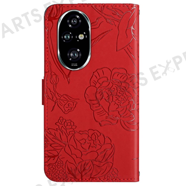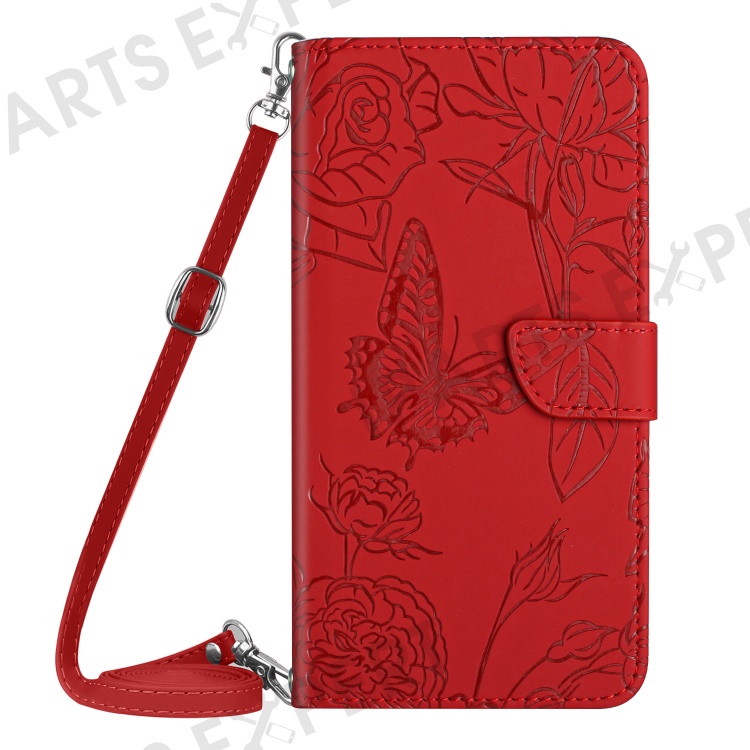 HT03 For Honor 200 5G Case with Shoulder Strap Butterfly Flowers Leather Phone Cover - Red