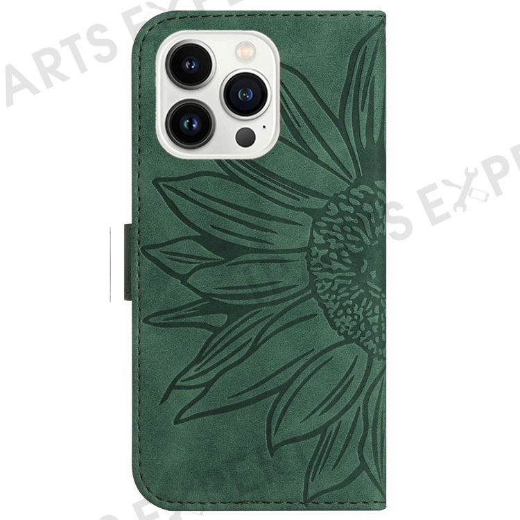 HT04 For iPhone 16 Pro Case Sunflower Imprint Leather Phone Cover with Shoulder Strap - Dark Green