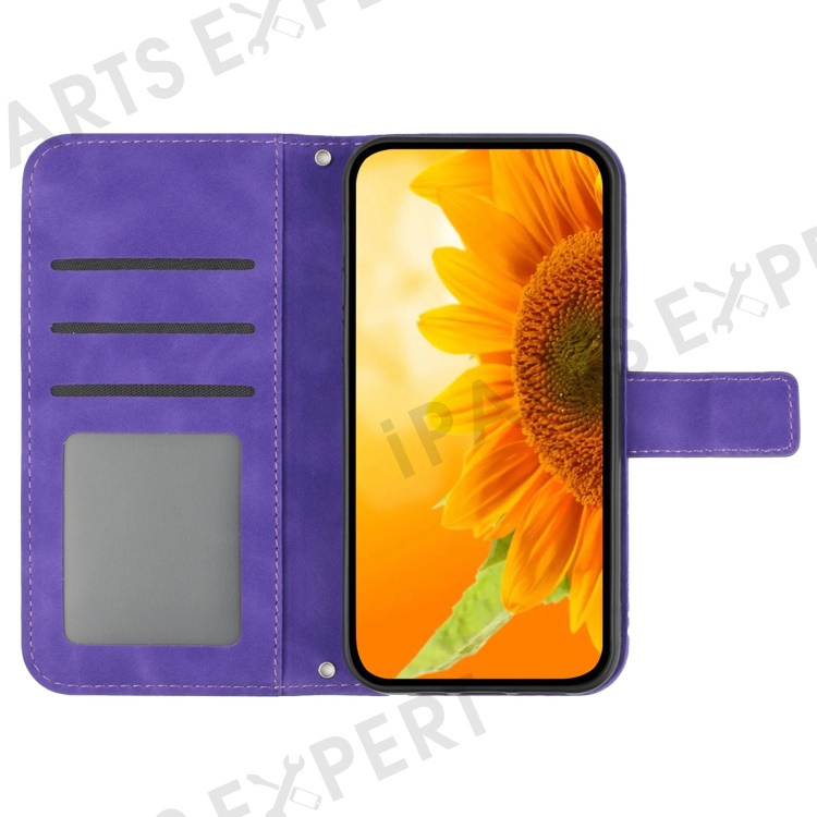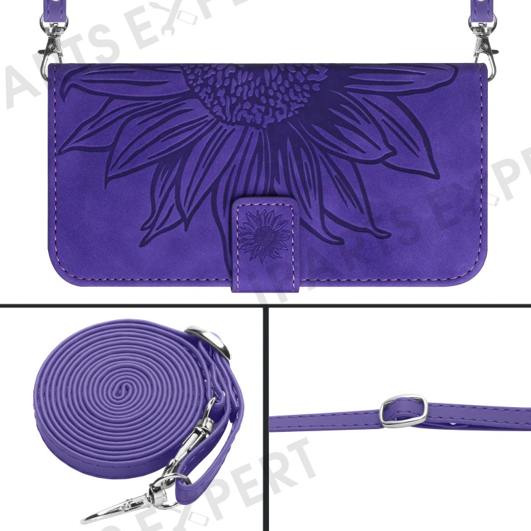 HT04 For iPhone 16 Pro Case Sunflower Imprint Leather Phone Cover with Shoulder Strap - Dark Purple