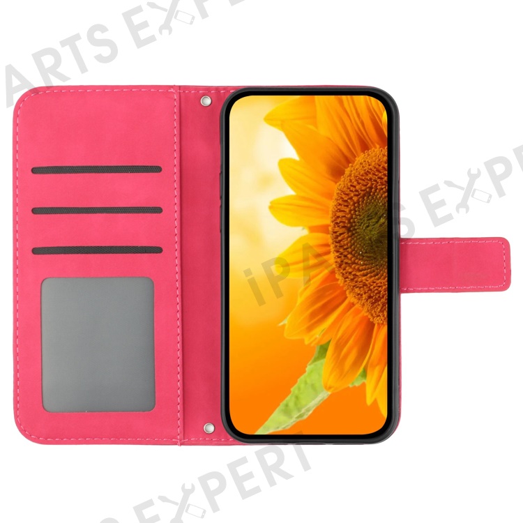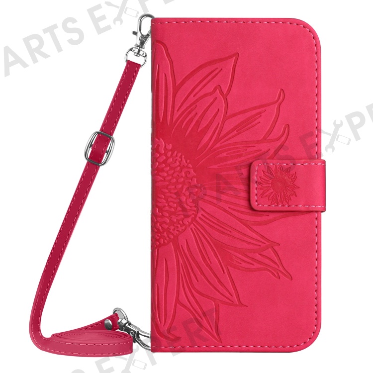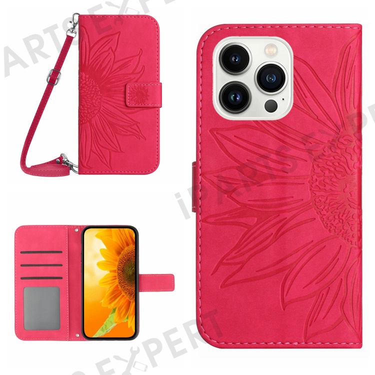 HT04 For iPhone 16 Pro Case Sunflower Imprint Leather Phone Cover with Shoulder Strap - Rose