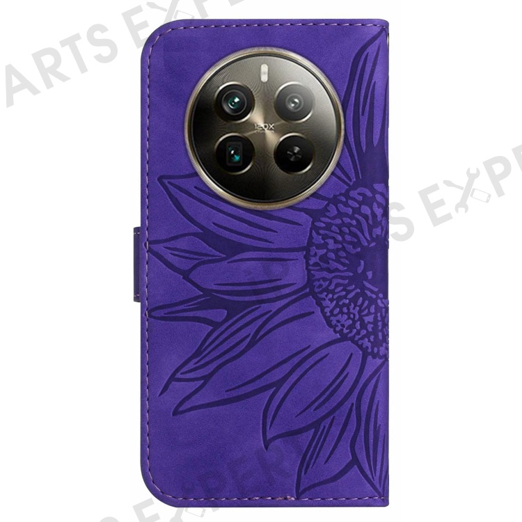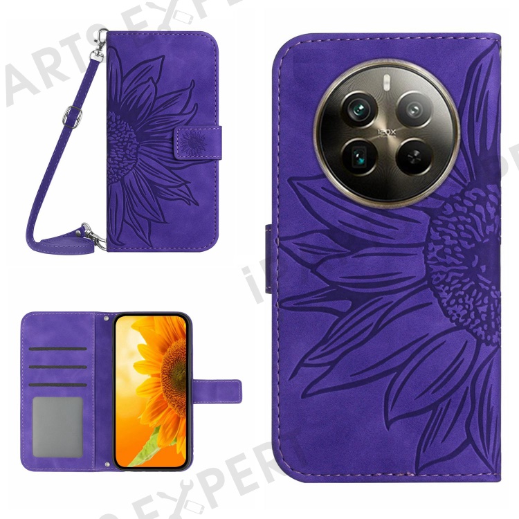 HT04 For Realme 12 4G / 12+ 5G Crossbody Case Sunflower PU Leather Flip Wallet Phone Cover - Dark Purple