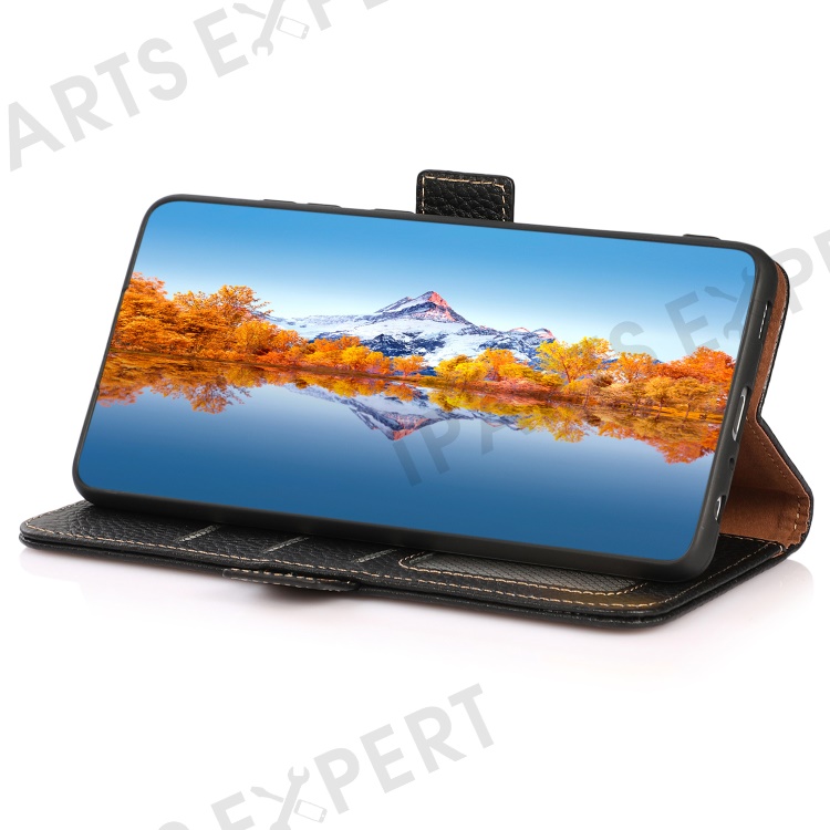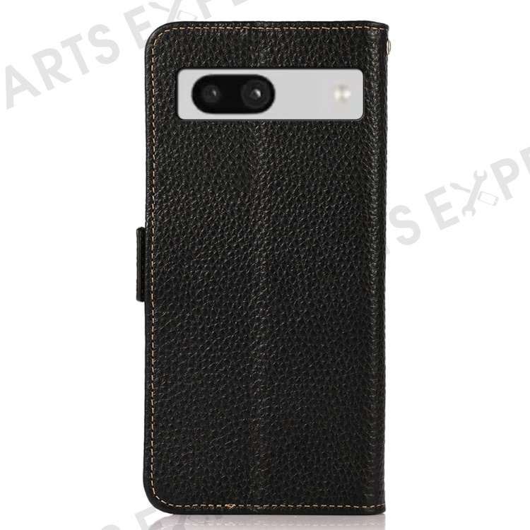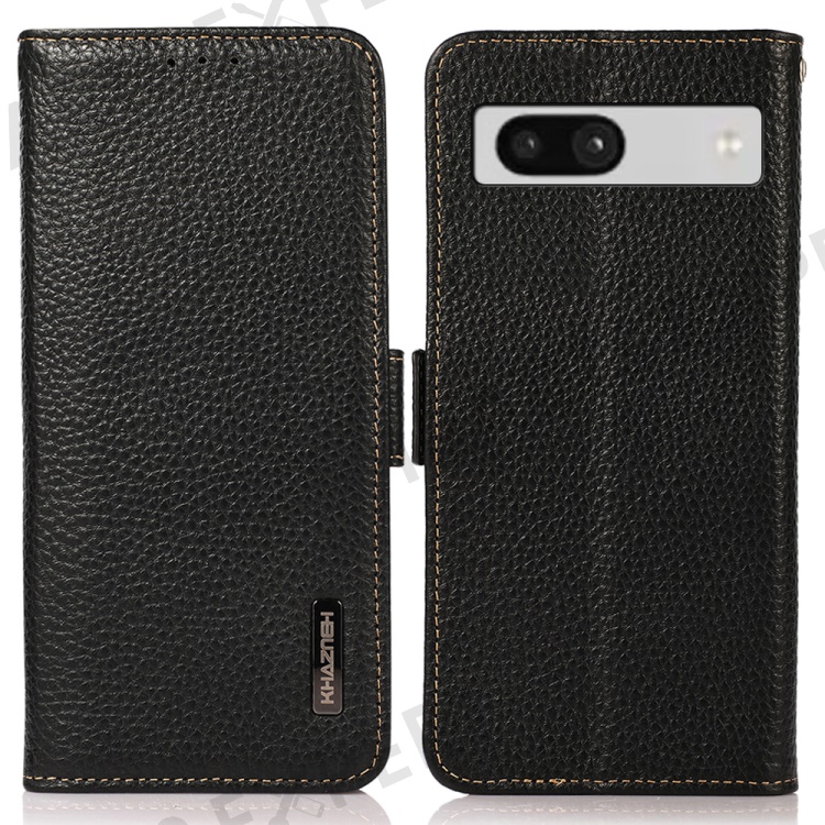 KHAZNEH For Google Pixel 7a RFID Blocking Phone Stand Case Genuine Cow Leather Wallet Drop-proof Cover - Black
