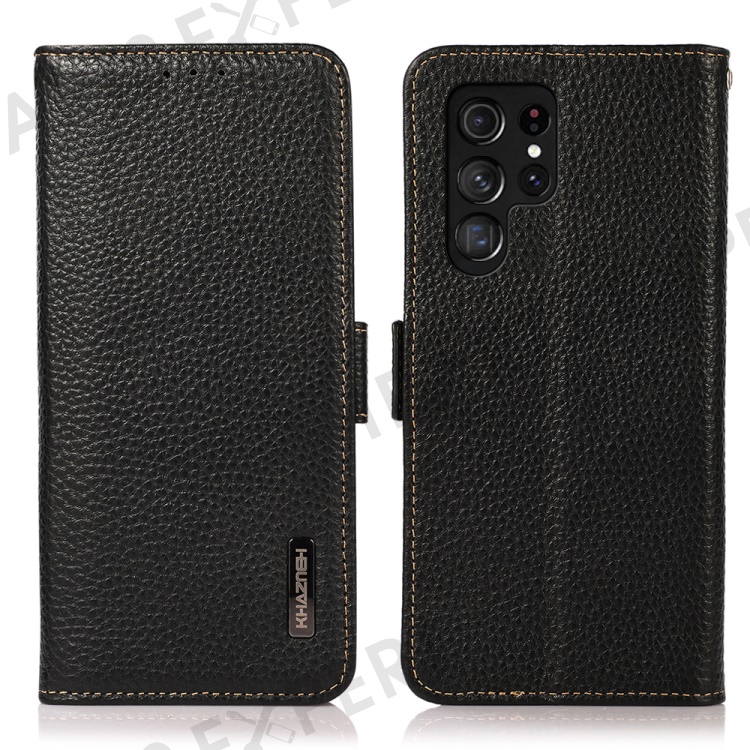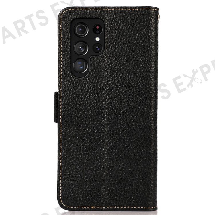 KHAZNEH For Samsung Galaxy S24 Ultra Phone Case Genuine Cow Leather Wallet Stand Cover - Black