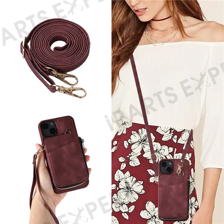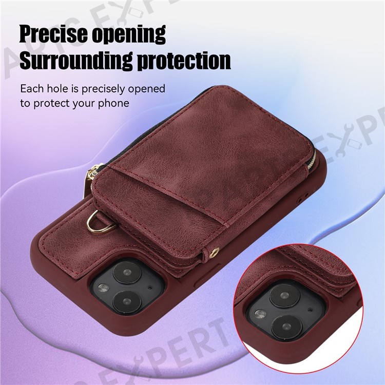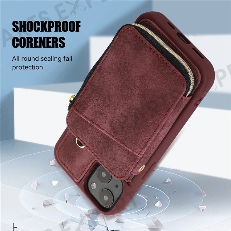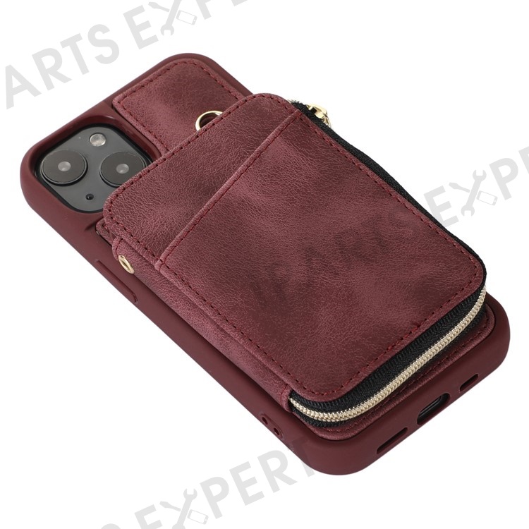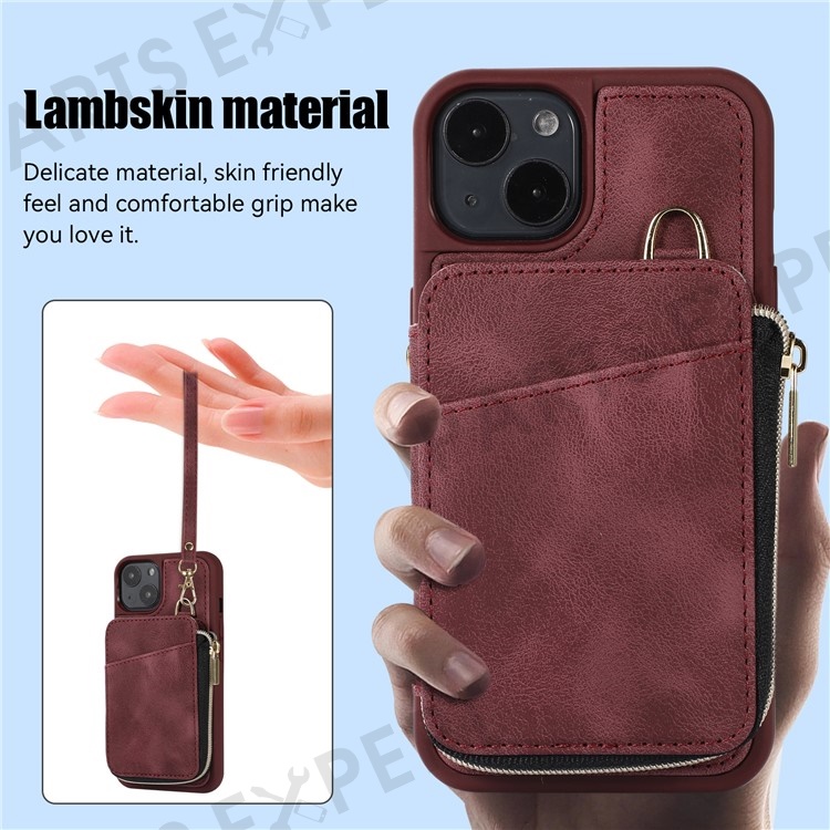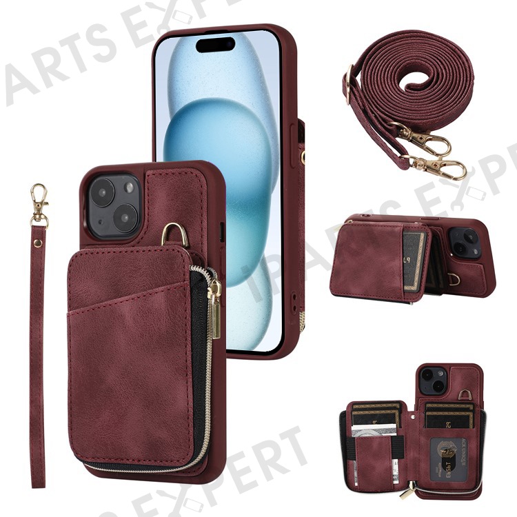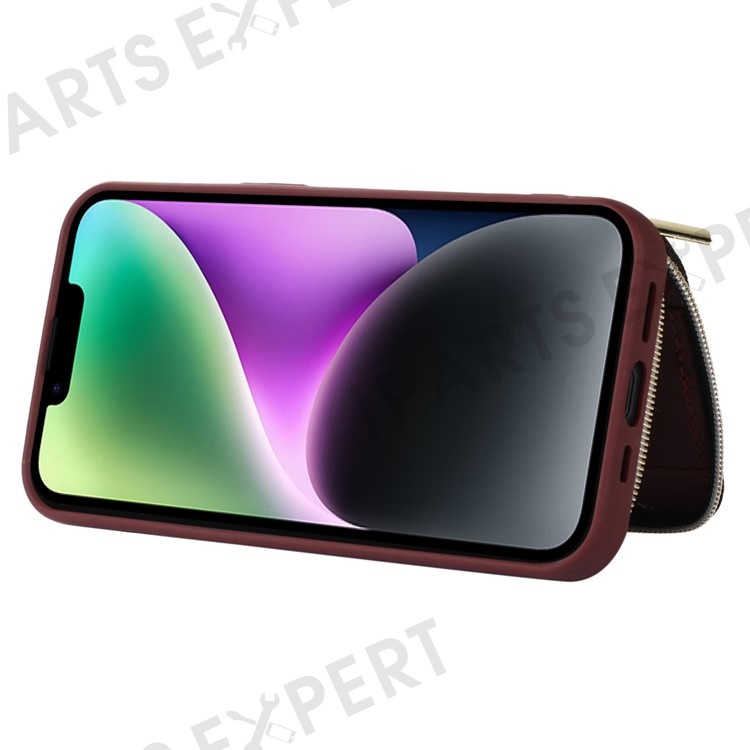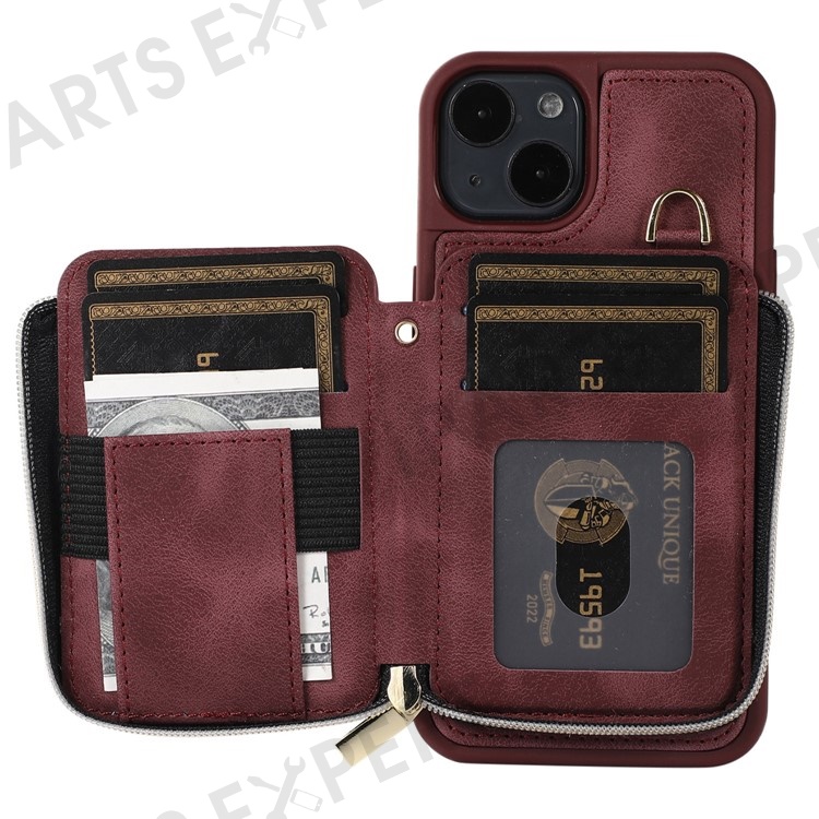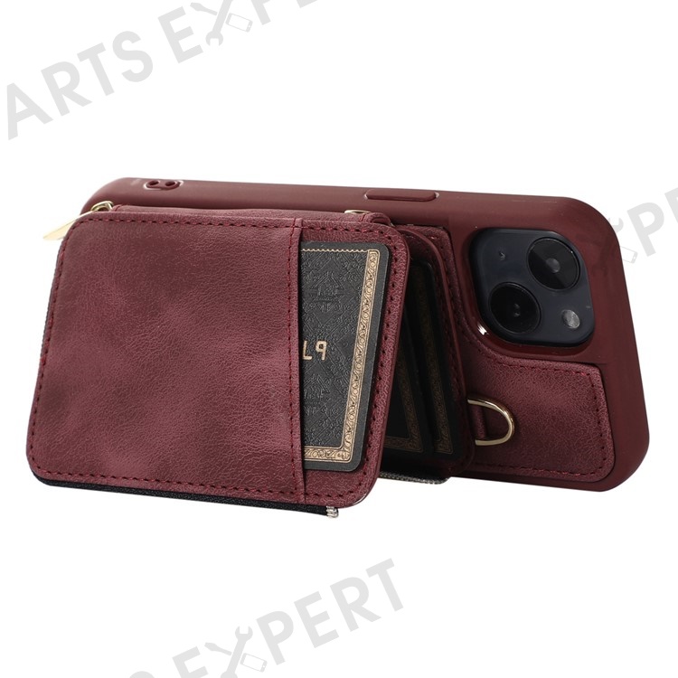 Kickstand Leather Coated TPU Case for iPhone 15 Plus , Zipper Wallet Cell Phone Cover - Wine Red