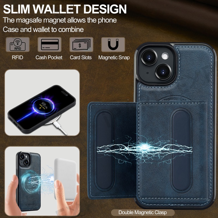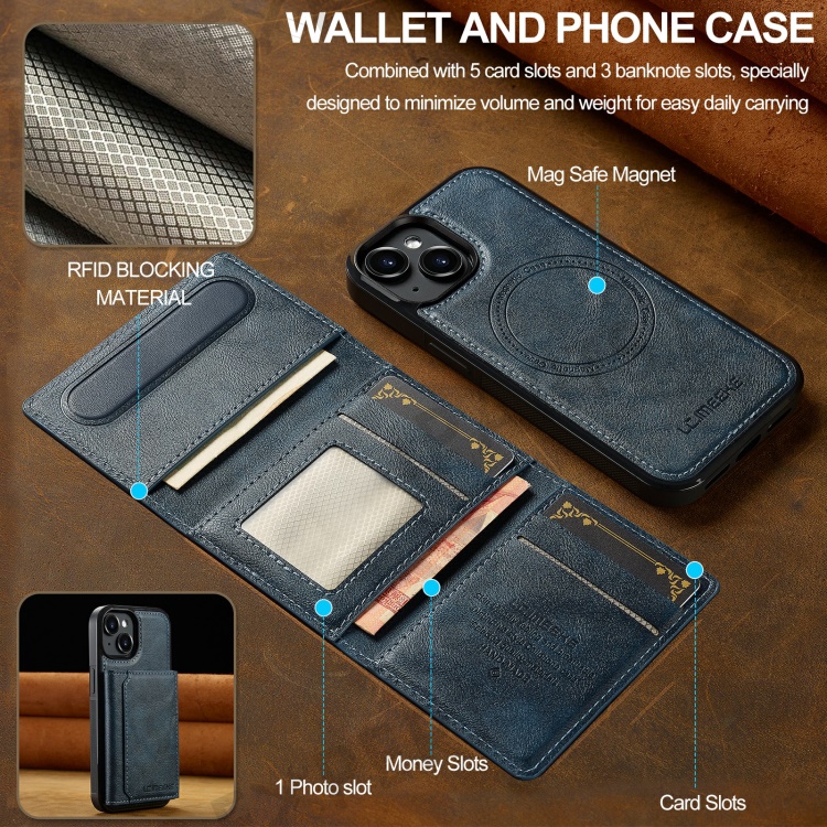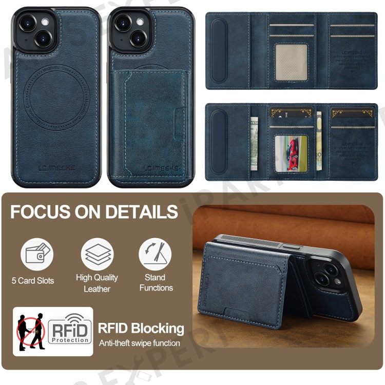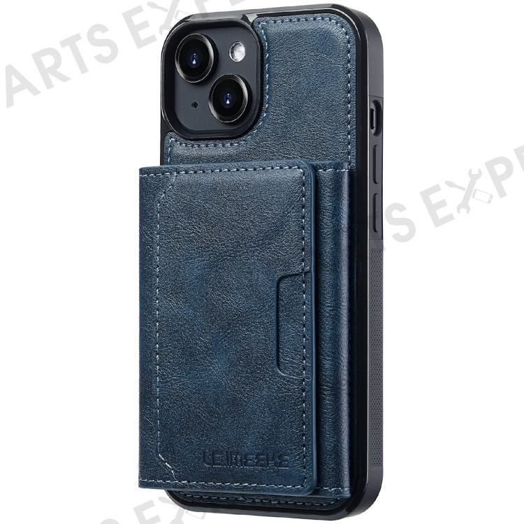 LC.IMEEKE L5 For iPhone 15 Plus Magnetic Phone Case Leather Back Cover with Detachable Card Holder - Blue