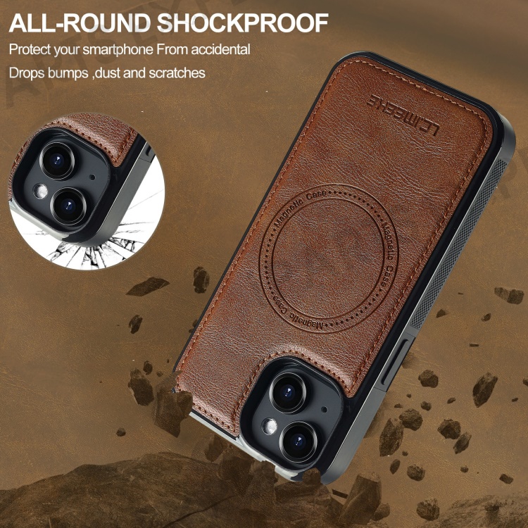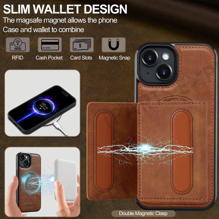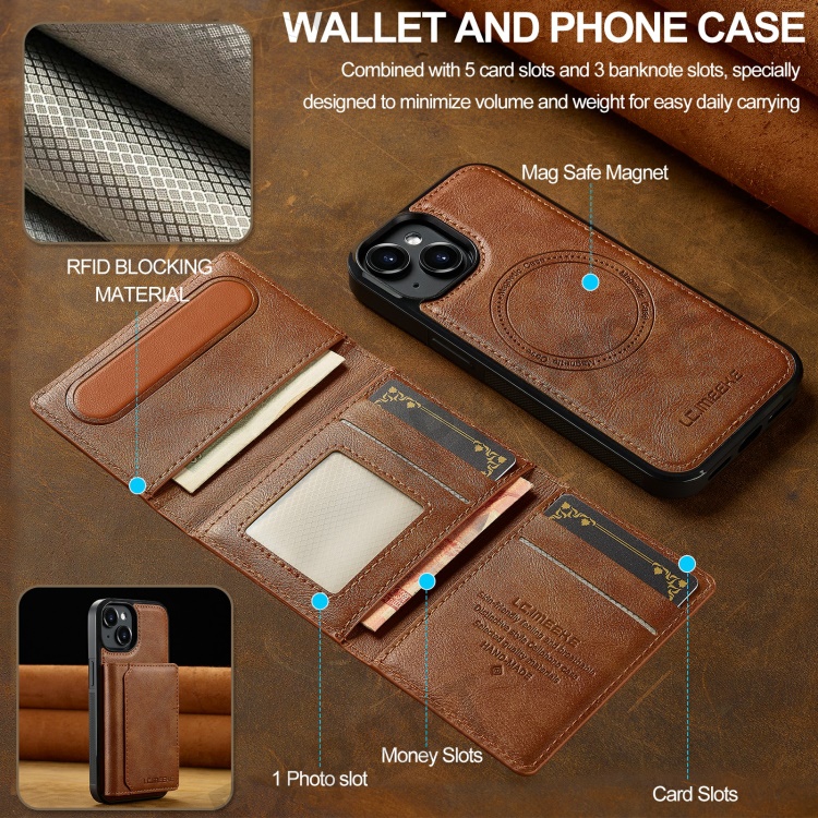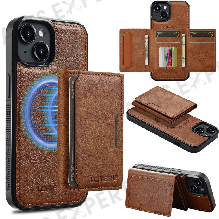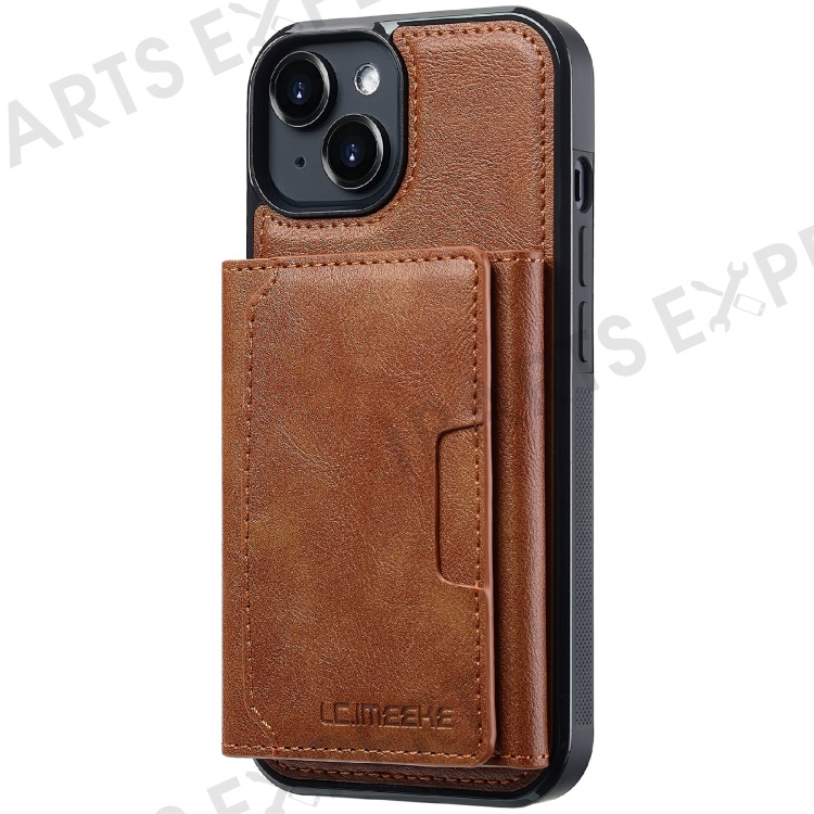 LC.IMEEKE L5 For iPhone 15 Plus Magnetic Phone Case Leather Back Cover with Detachable Card Holder - Brown