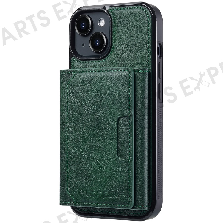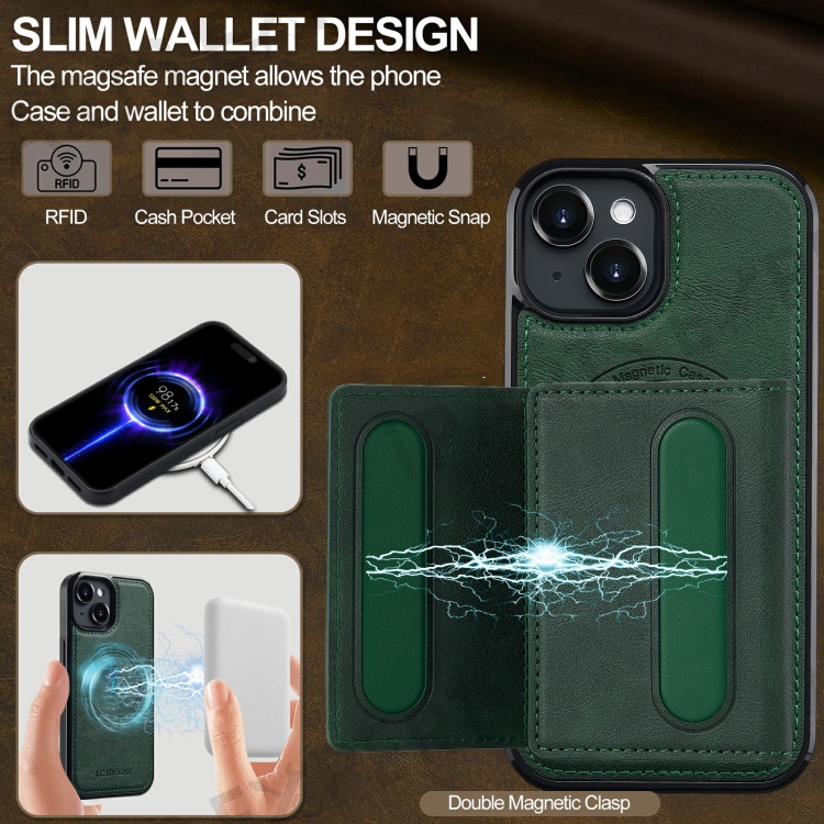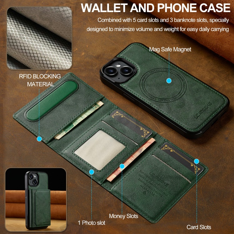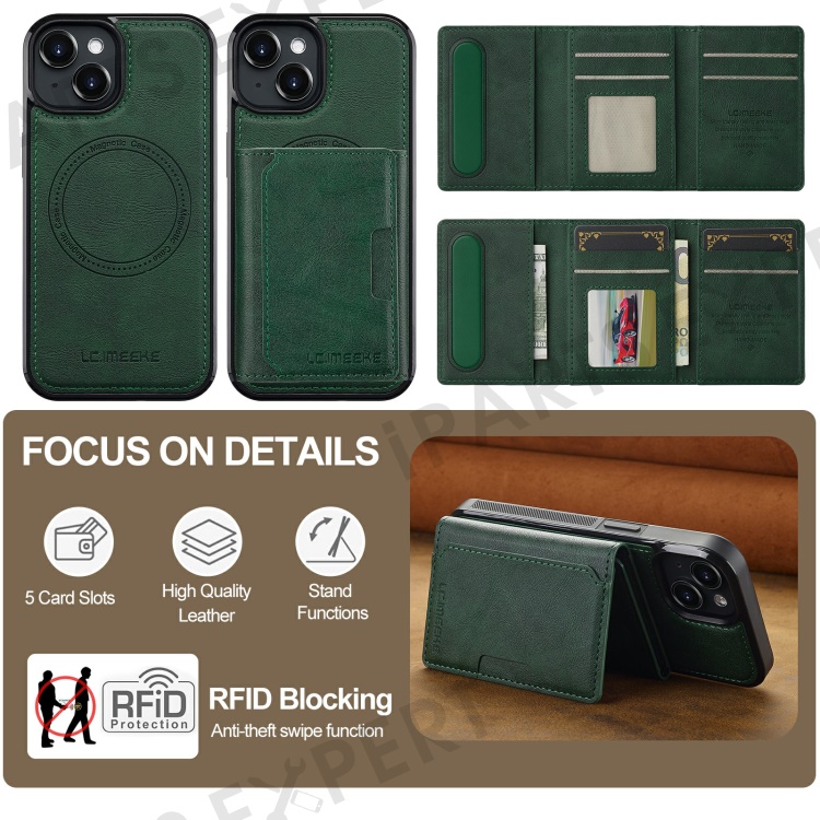 LC.IMEEKE L5 For iPhone 15 Plus Magnetic Phone Case Leather Back Cover with Detachable Card Holder - Green