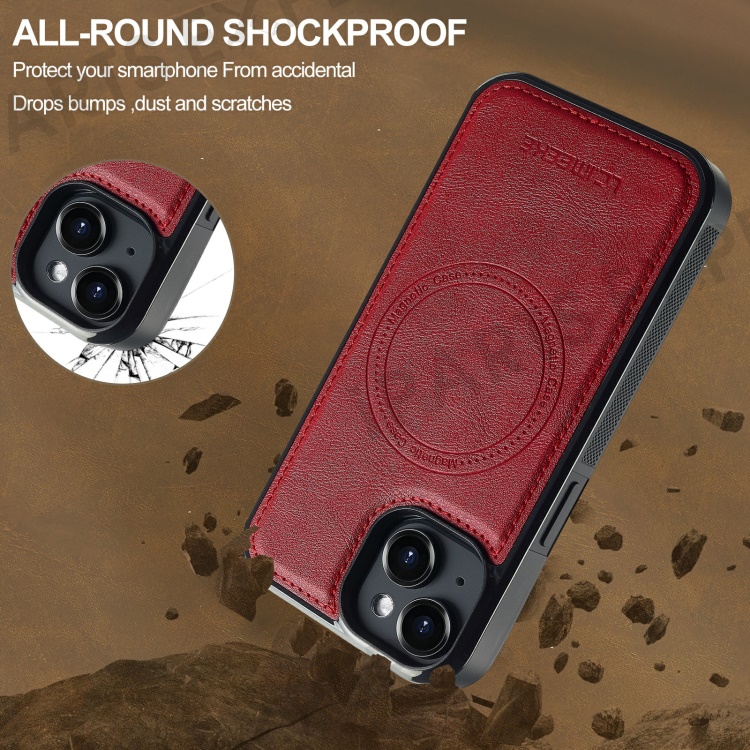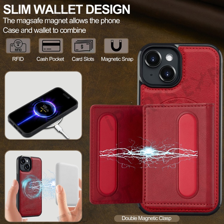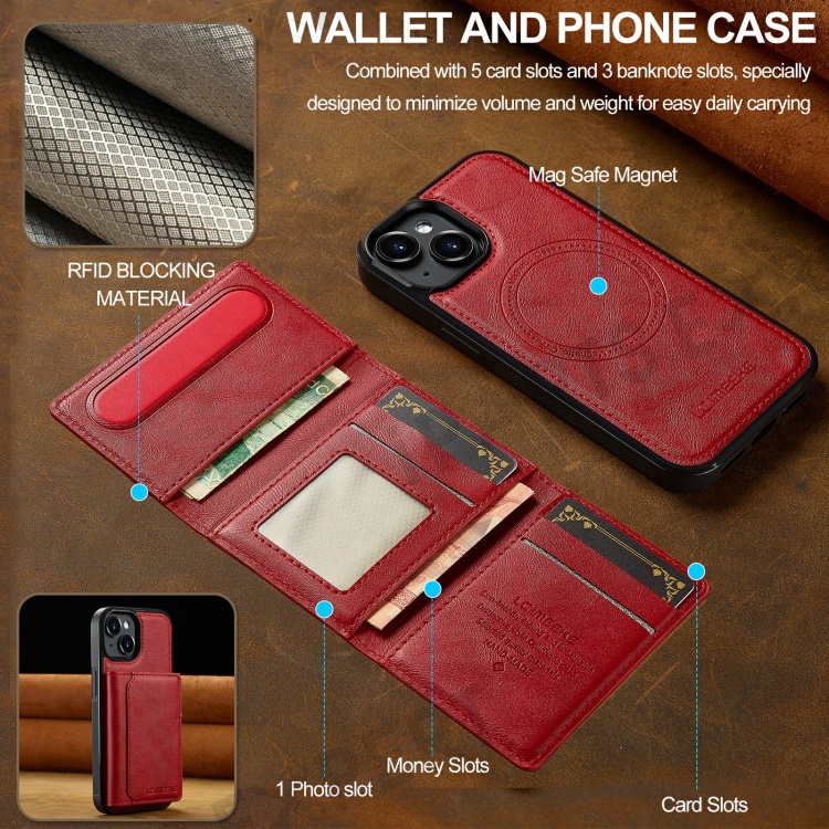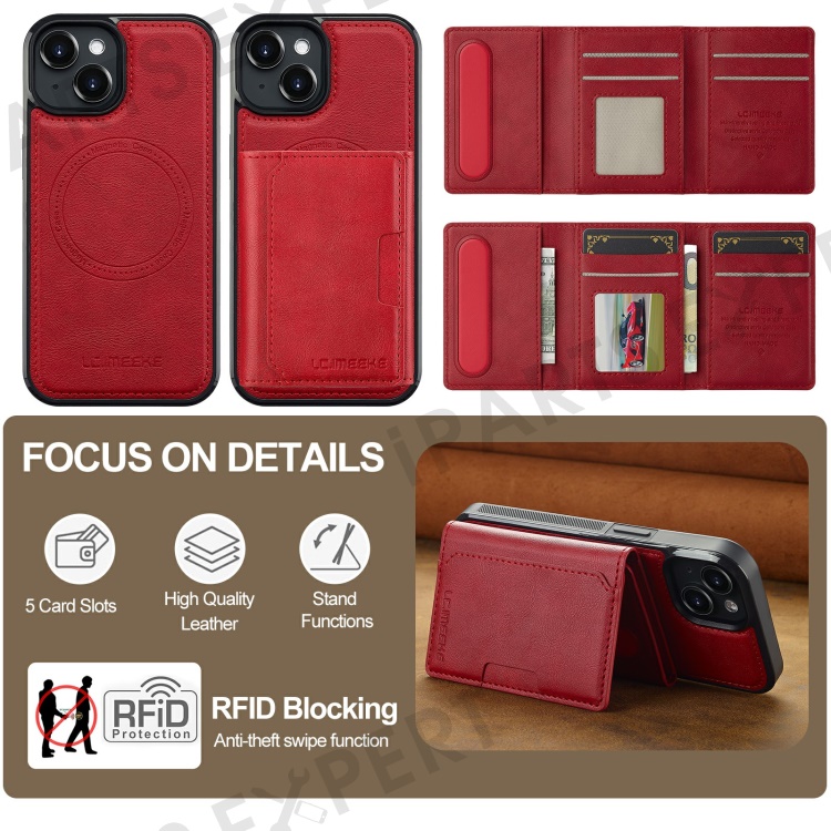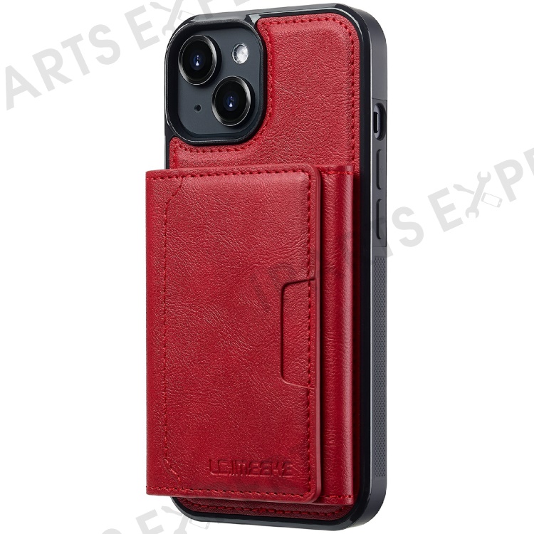 LC.IMEEKE L5 For iPhone 15 Plus Magnetic Phone Case Leather Back Cover with Detachable Card Holder - Red