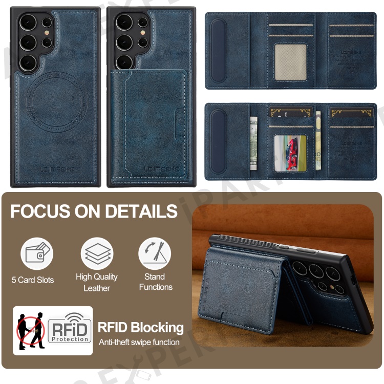 LC.IMEEKE L5 For Samsung Galaxy S22 Ultra 5G Magnetic Phone Case Leather Back Cover with Detachable Card Holder - Blue