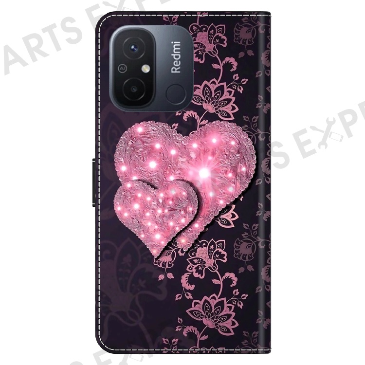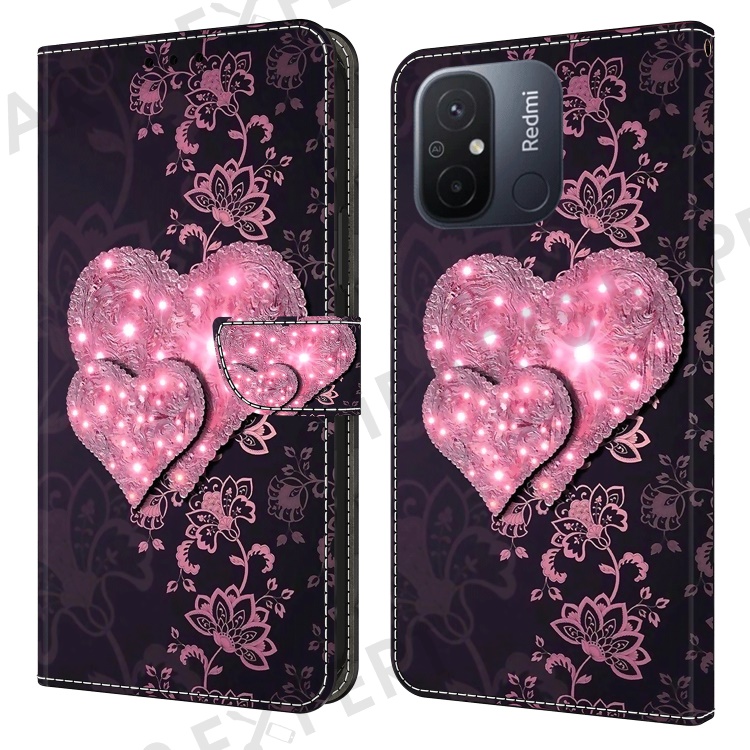 Leather Phone Case for Xiaomi Poco C55 4G / Redmi 11A 4G / 12C 4G , 3D Pattern Printing Stand Wallet Cover - Lace Hearts