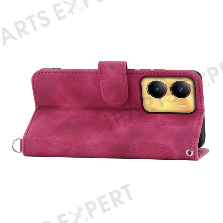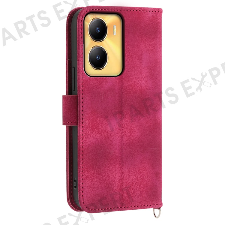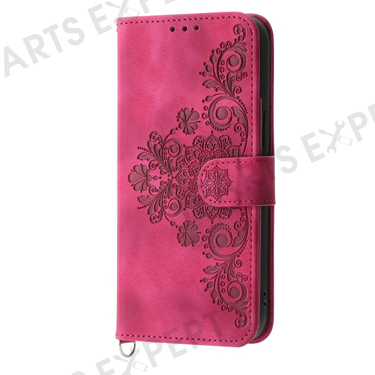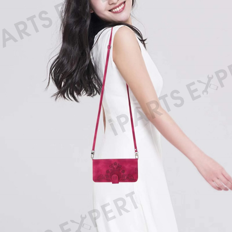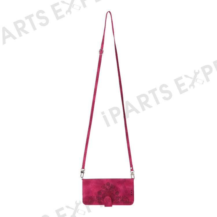 Leather Wallet Phone Case for vivo Y56 5G , Imprinted Flower Stand Cover with Wrist Strap and Shoulder Strap - Wine Red