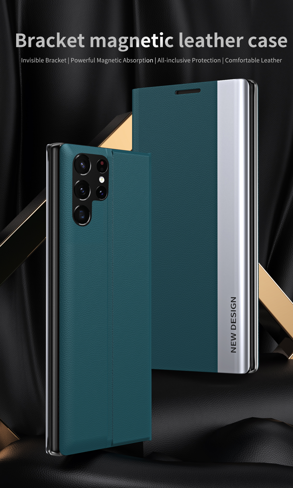 Light Slim Anti-drop PU Leather Phone Cover with Stand for Samsung Galaxy S22 Ultra 5G - Green