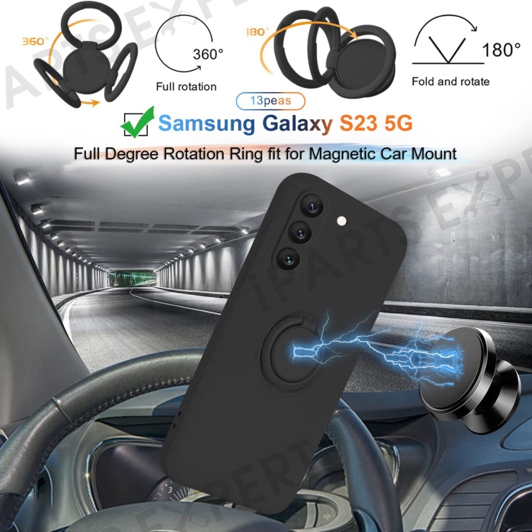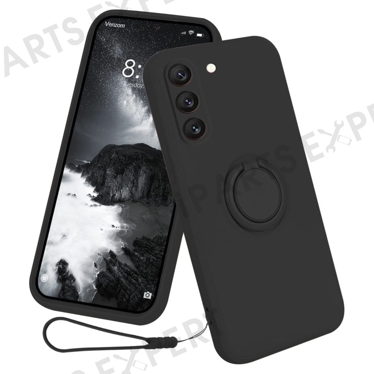 Liquid Silicone Phone Case for Samsung Galaxy S23 Ring Kickstand Phone Back Cover with Lanyard - Black