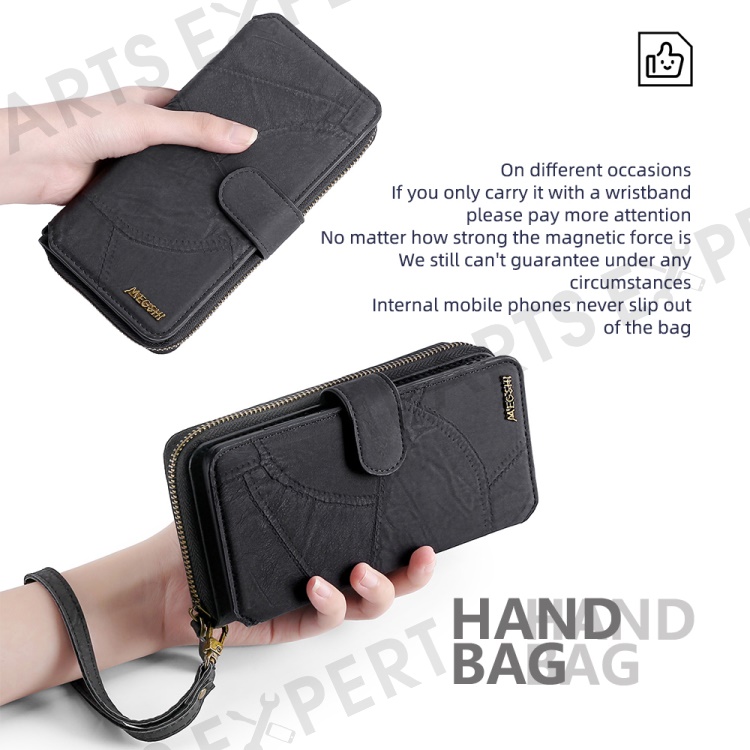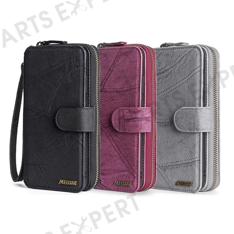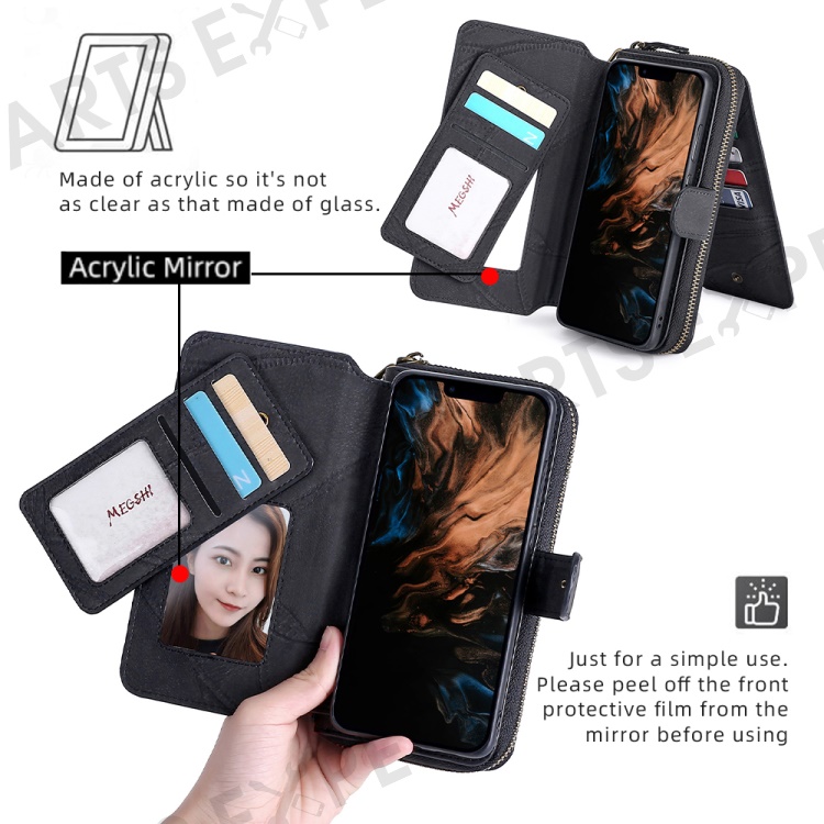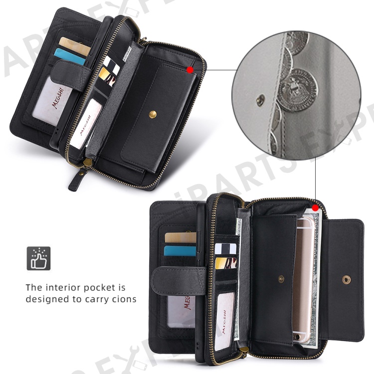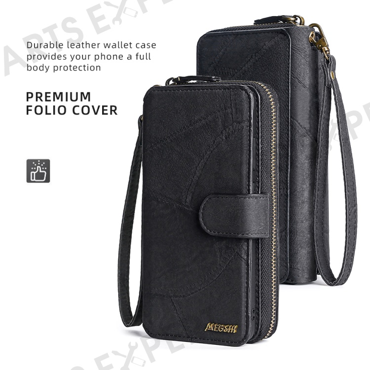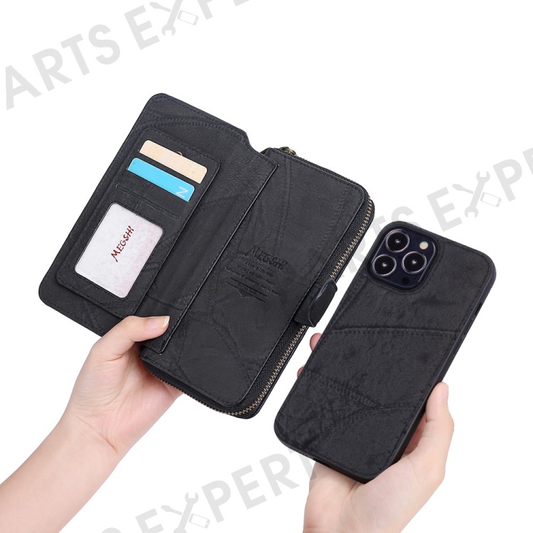 MEGSHI 004 Series Scratch Resistant Magnetic Detachable Stand Design Zipper Pocket Shockproof PU Leather TPU Wallet Cover for iPhone 13 Pro Max 6.7 inch - Black