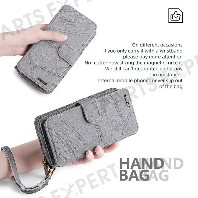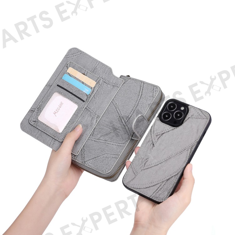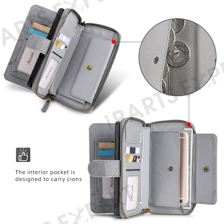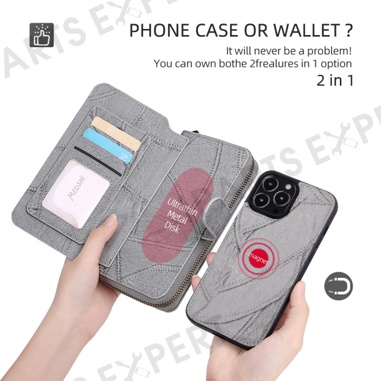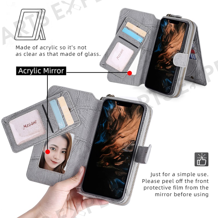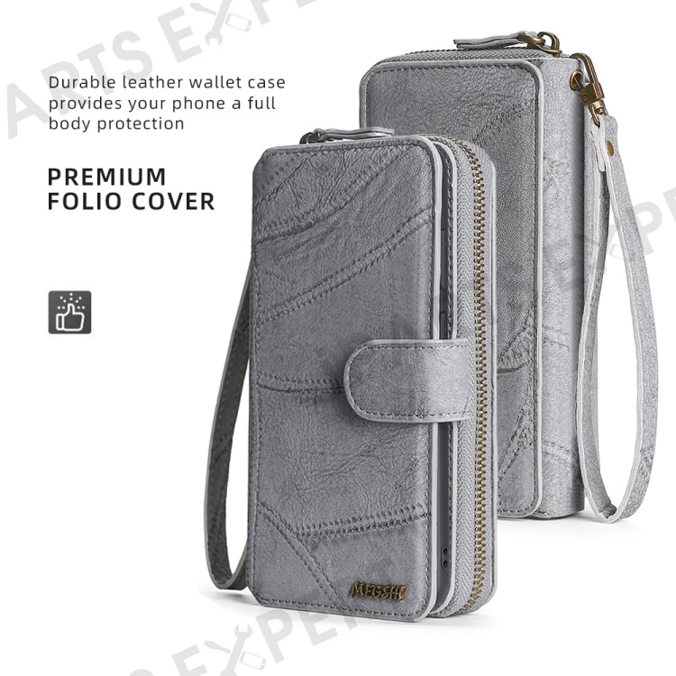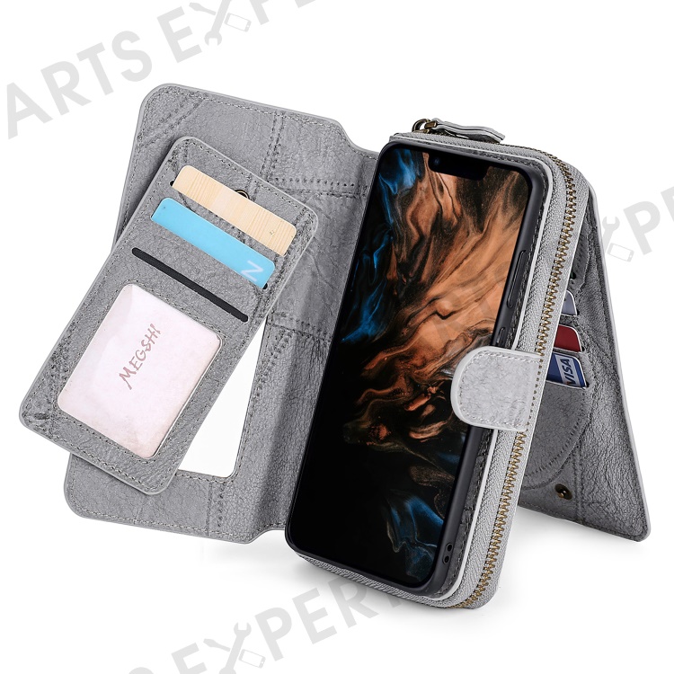MEGSHI 004 Series Scratch Resistant Magnetic Detachable Stand Design Zipper Pocket Shockproof PU Leather TPU Wallet Cover for iPhone 13 Pro Max 6.7 inch - Grey