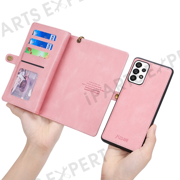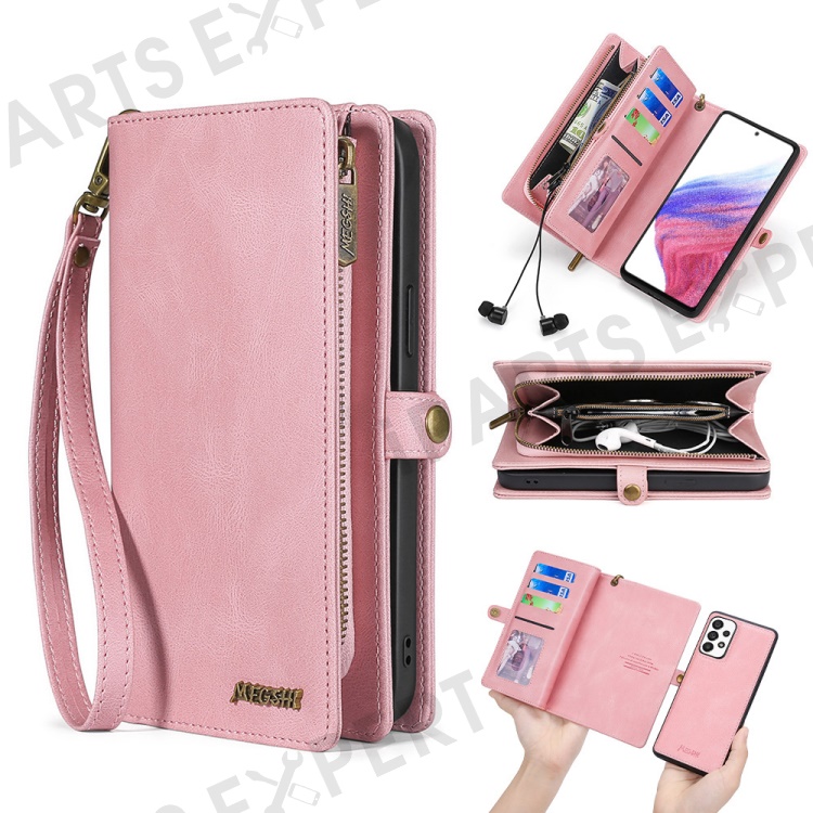 MEGSHI 017 Series Detachable Leather Case for Samsung Galaxy A73 5G , Magnetic Absorption Zipper Wallet with Wrist Strap - Rose Gold