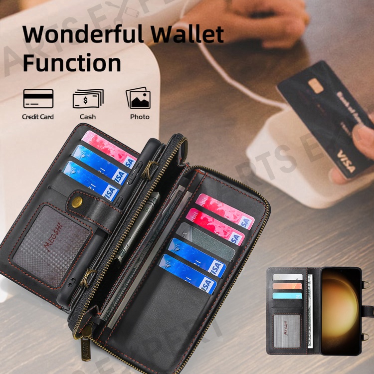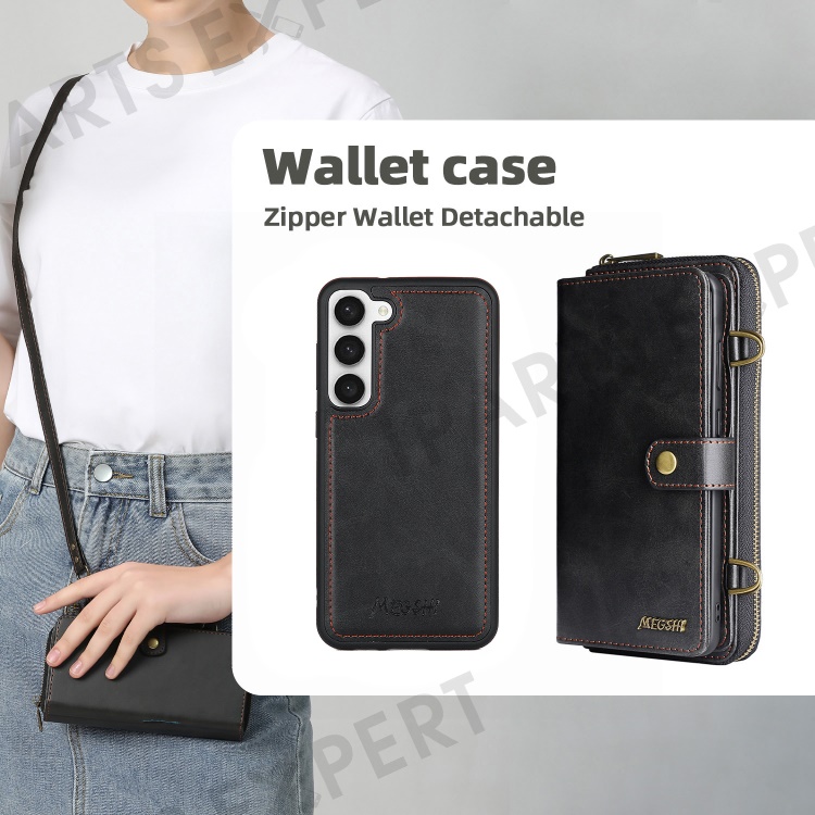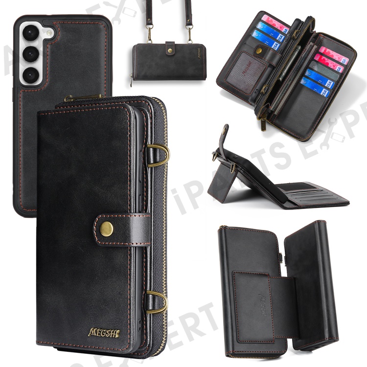 MEGSHI 020 Series for Samsung Galaxy S23 Detachable 2-in-1 PU Leather+PC+TPU Phone Wallet Stand Case with Shoulder Strap - Black