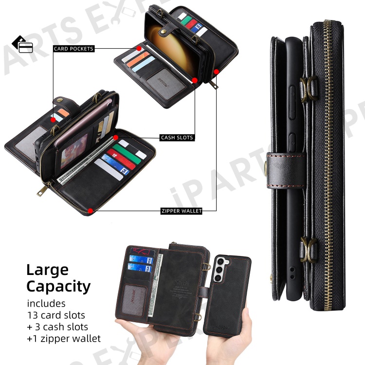 Designed with 13 card slots, cash compartments and zipper pocket for convenient storage