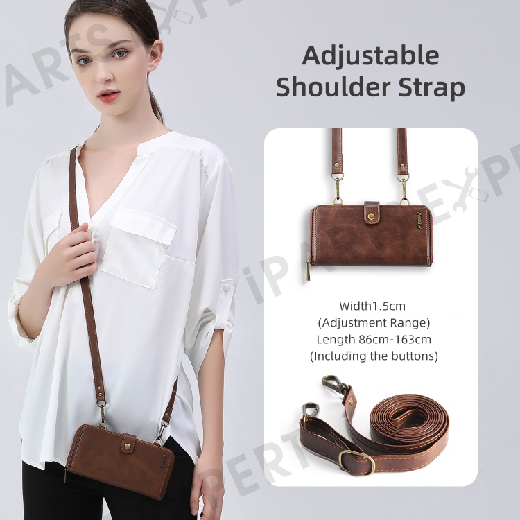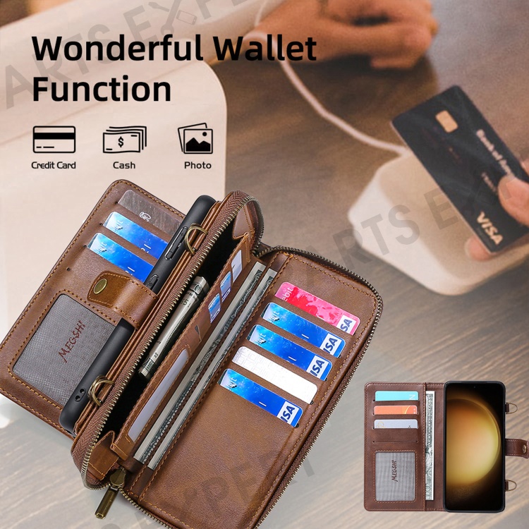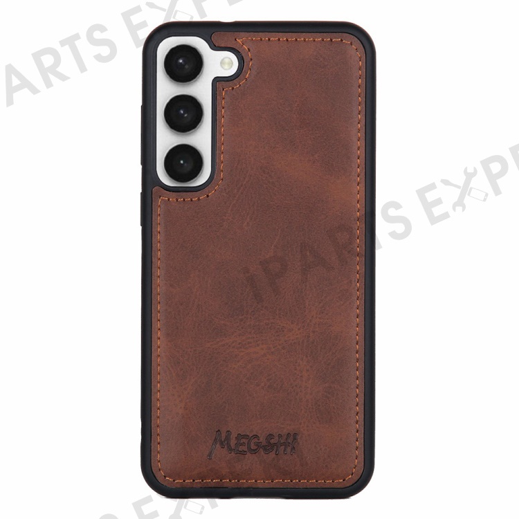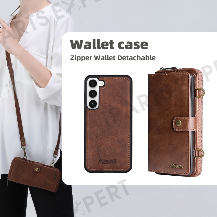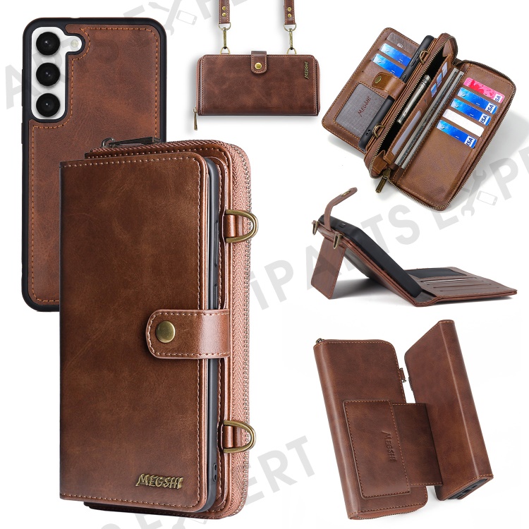 MEGSHI 020 Series for Samsung Galaxy S23 Detachable 2-in-1 PU Leather+PC+TPU Phone Wallet Stand Case with Shoulder Strap - Brown